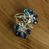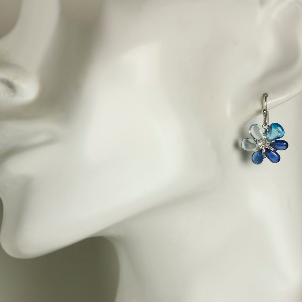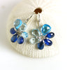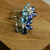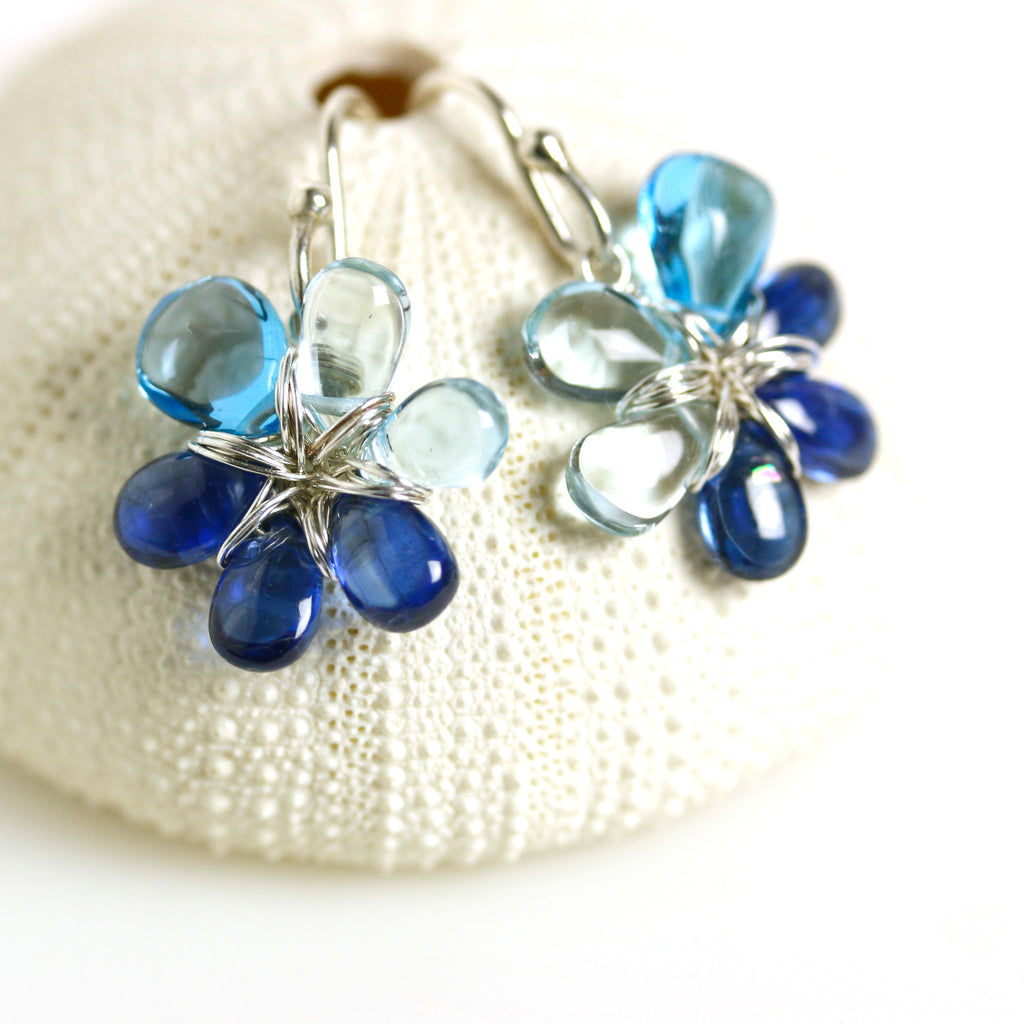 A full range of cheerful blues here--sky blue topaz, swiss blue topaz and kyanite. They are meticulously wrapped in argentium sterling wire and suspend from french earwires.