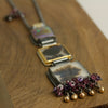 The chain adjusts from 16 to 18 inches and is accented on one side with a smoky quartz briolette and more rhodolite garnets.