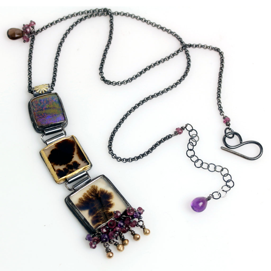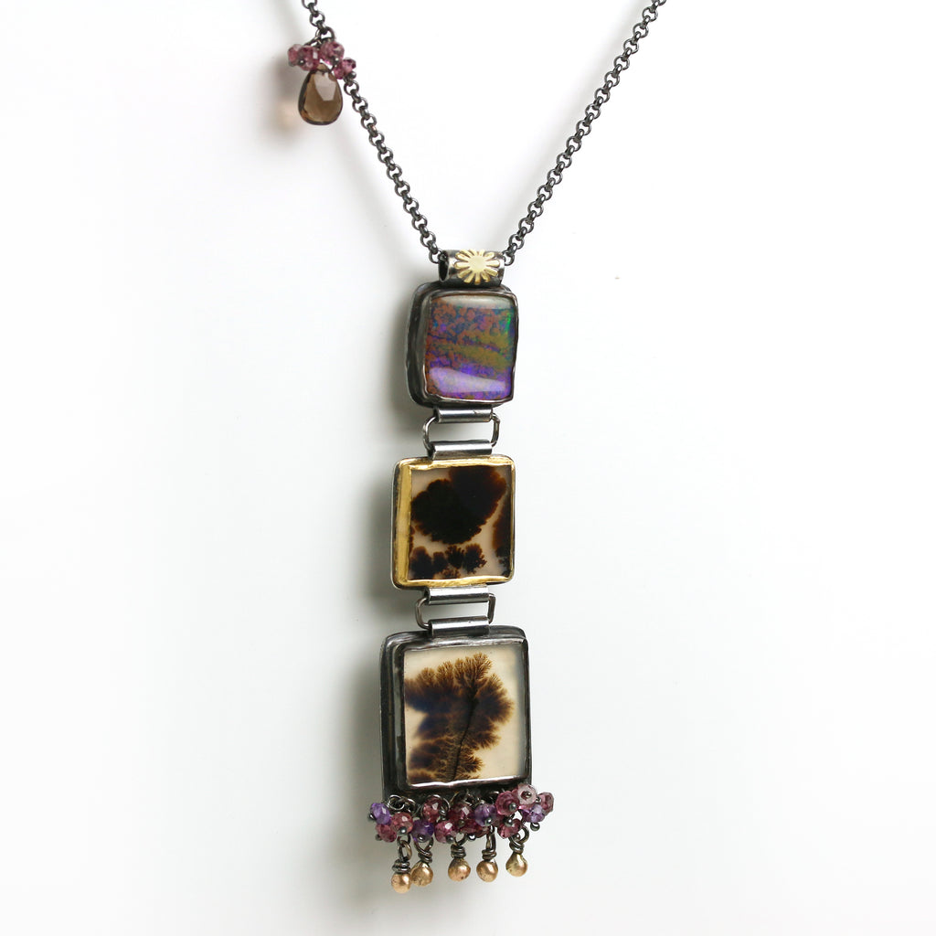 Look closely at the lovely detail of this boulder opal. Some of its color is reflected in the fringe of gemstone beads added to the lower dendritic agate--rhodolite garnet and amethyst on silver pins. And below the fringe dangle five 14k drops.