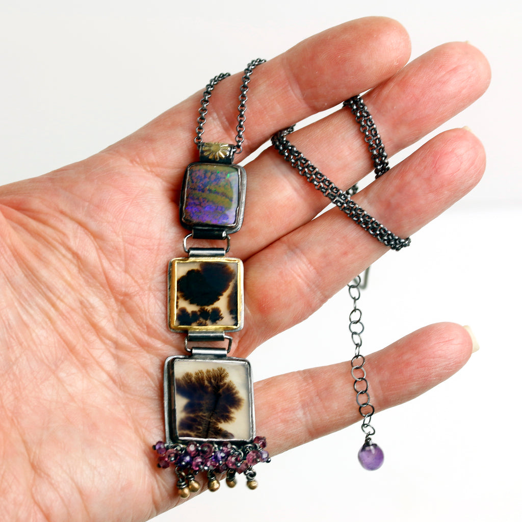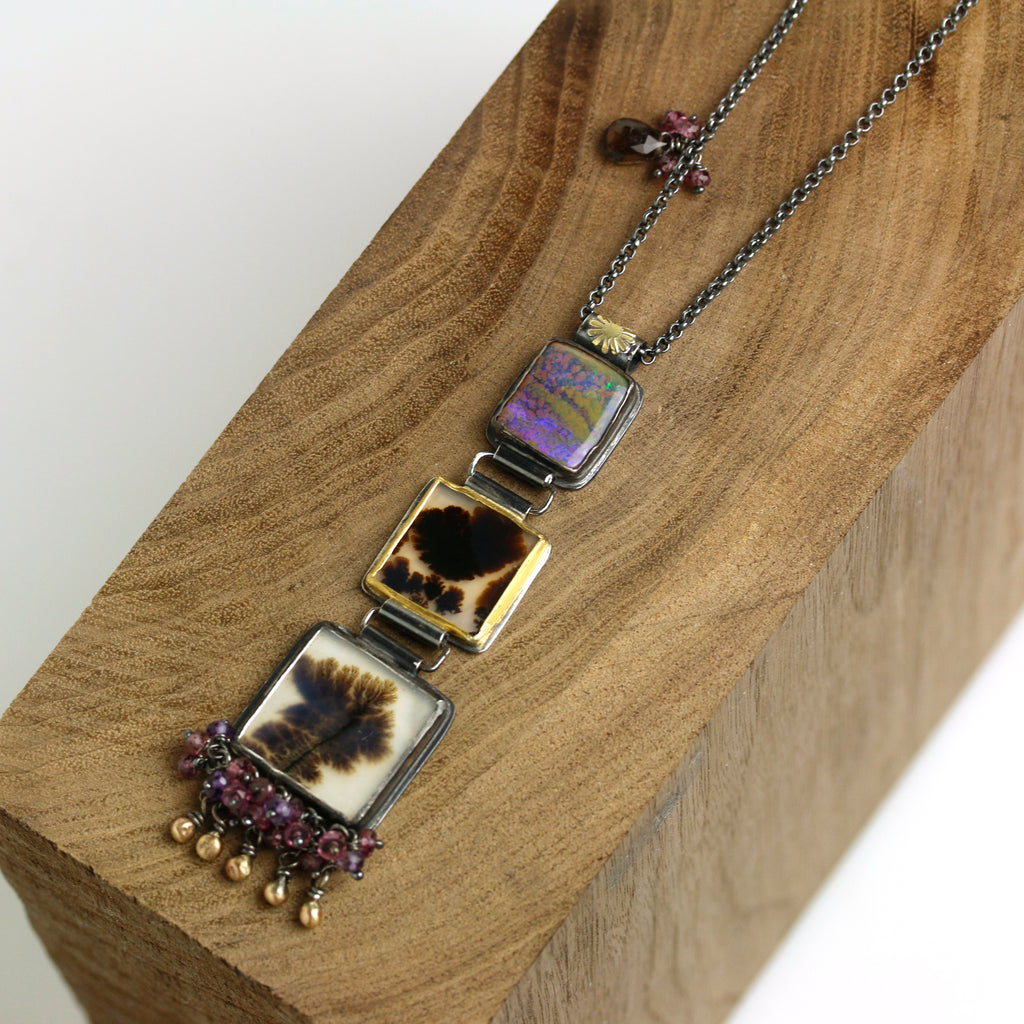 Two dendritic agates and a boulder opal are linked and stacked in this unique piece.