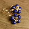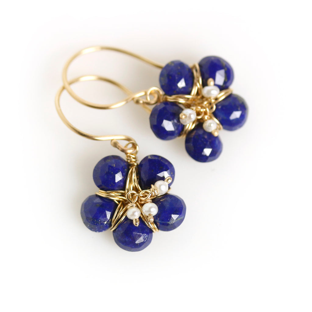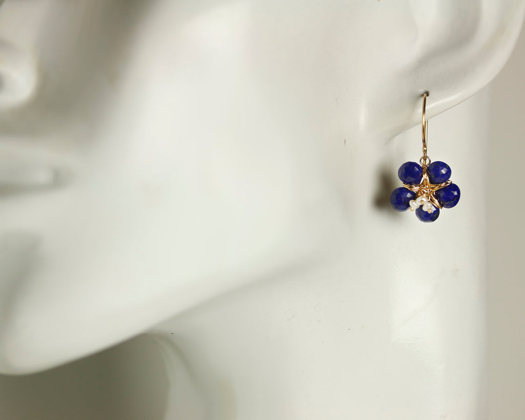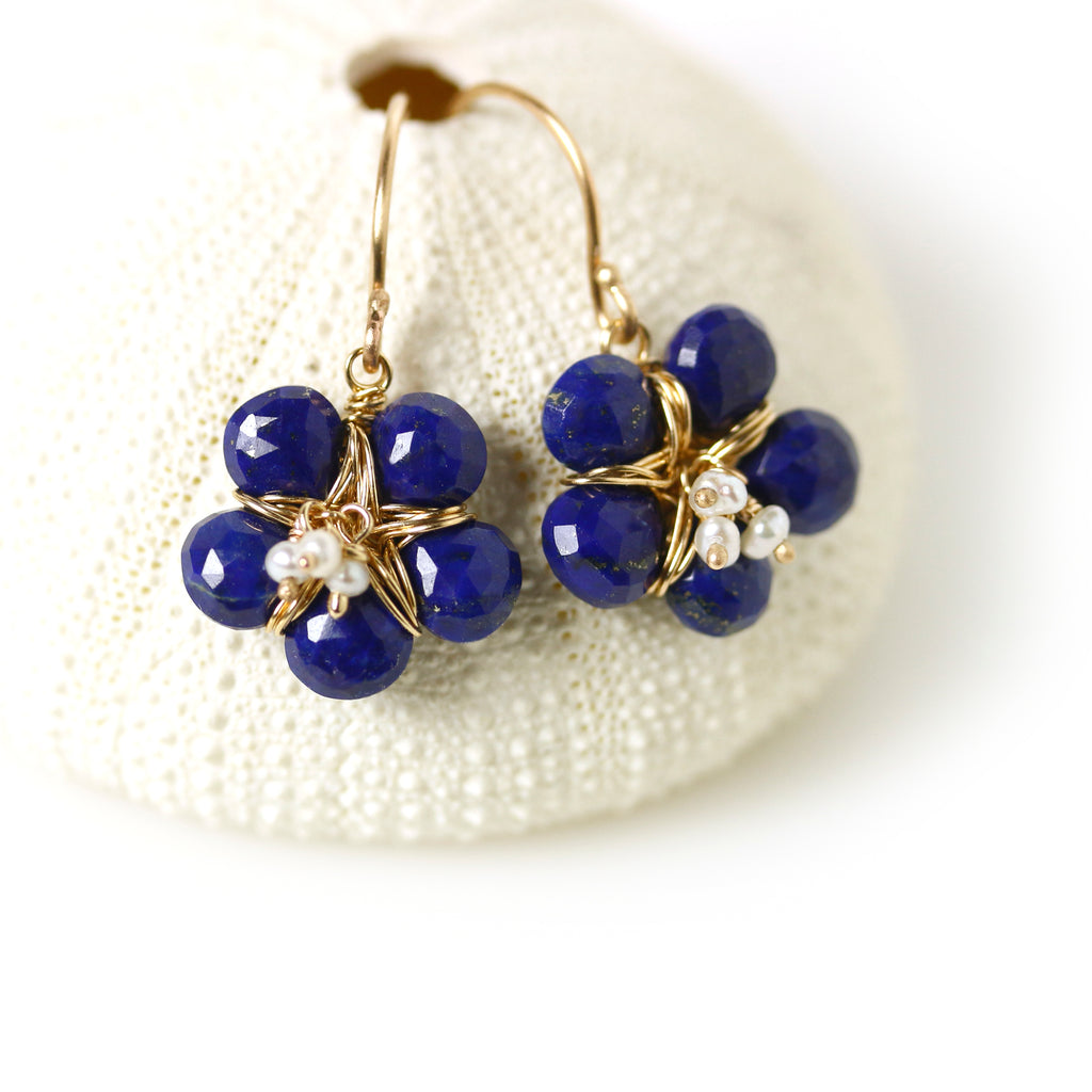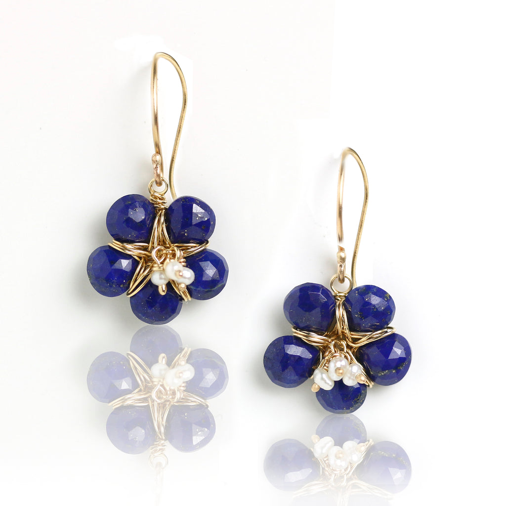 Faceted lapis petals are woven with gold fill wire and a sweet cluster of tiny freshwater pearls on 14k gold pins dangle at the center. Earwires are gold filled or solid 14k--make your selection.