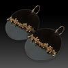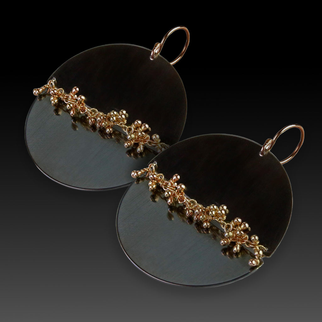 These earrings feature a stunning contrast between blackened silver and gleaming gold. The brushed and graphic black discs split in two are joined by a seam of woven 14k gold sprouts--a lively contrast in texture. The discs are 1 1/2 inches in diameter and the earrings hang just under 2 3/4 inches in length.