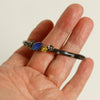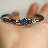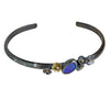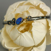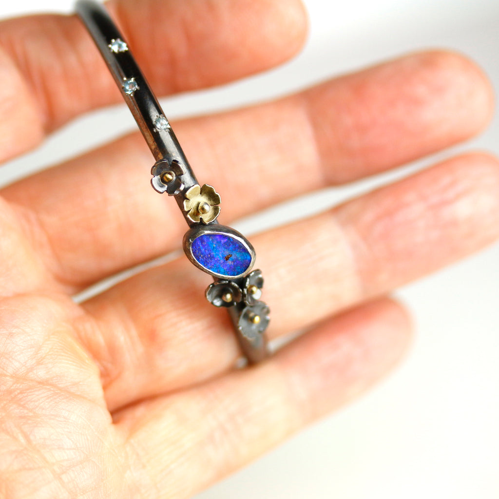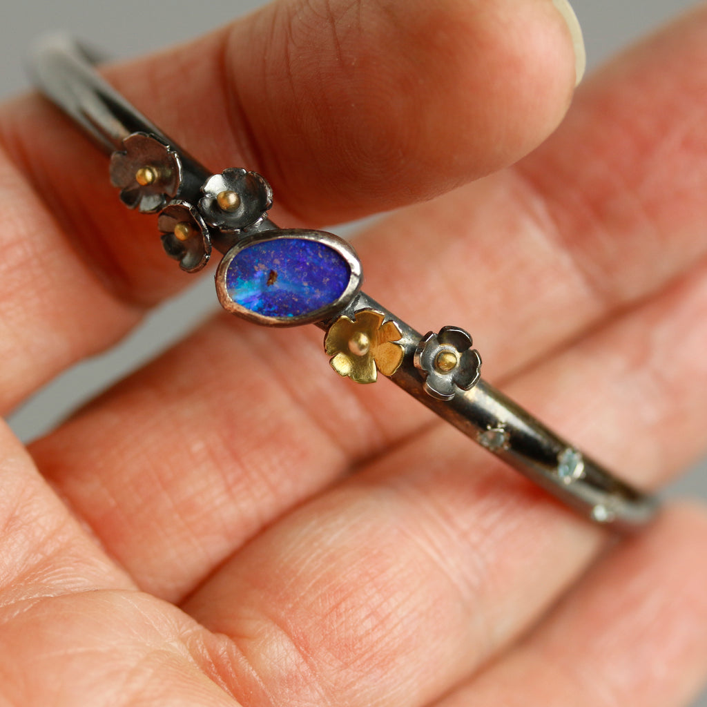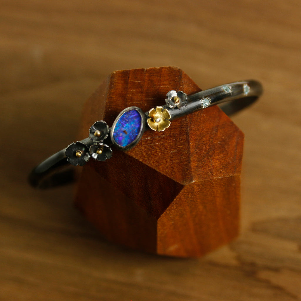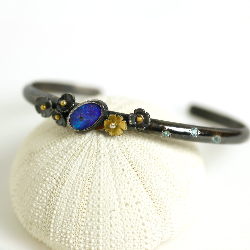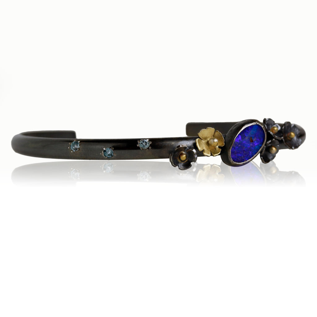 This sweet boulder opal with deep tones of violet and blue is set asymetrically to one side on a half domed cuff. Silver and 18k gold flowers are scattered left and right and three blue topaz are flush set on the opposite side of the cuff.