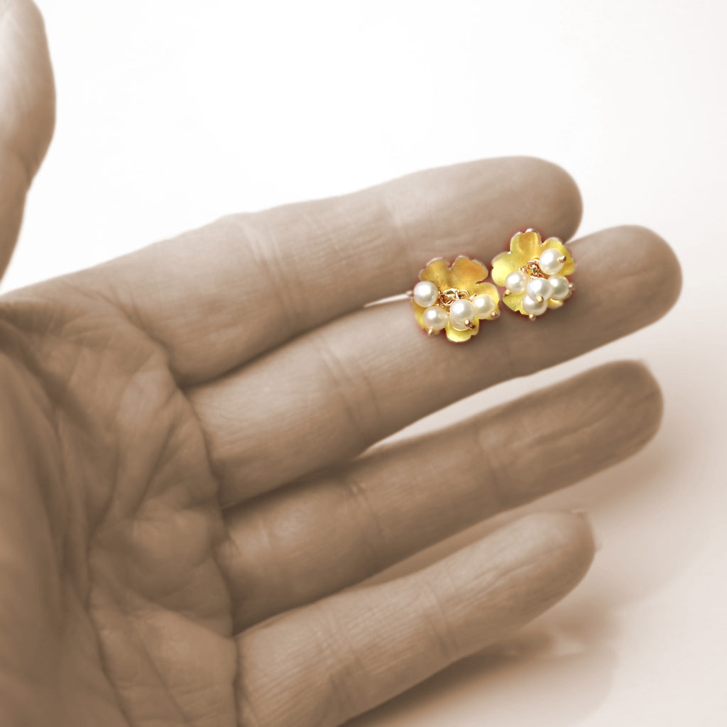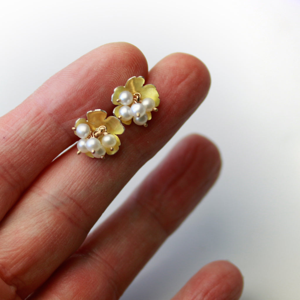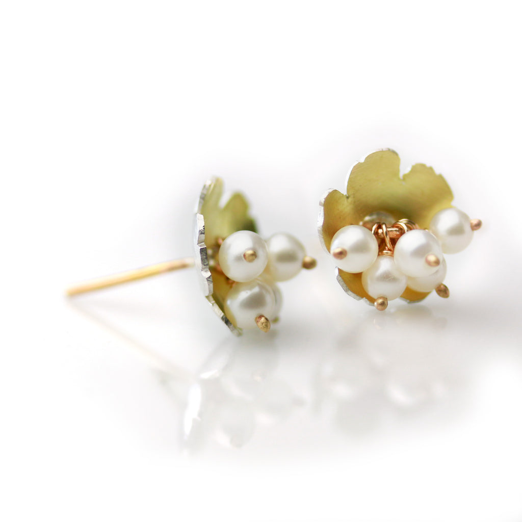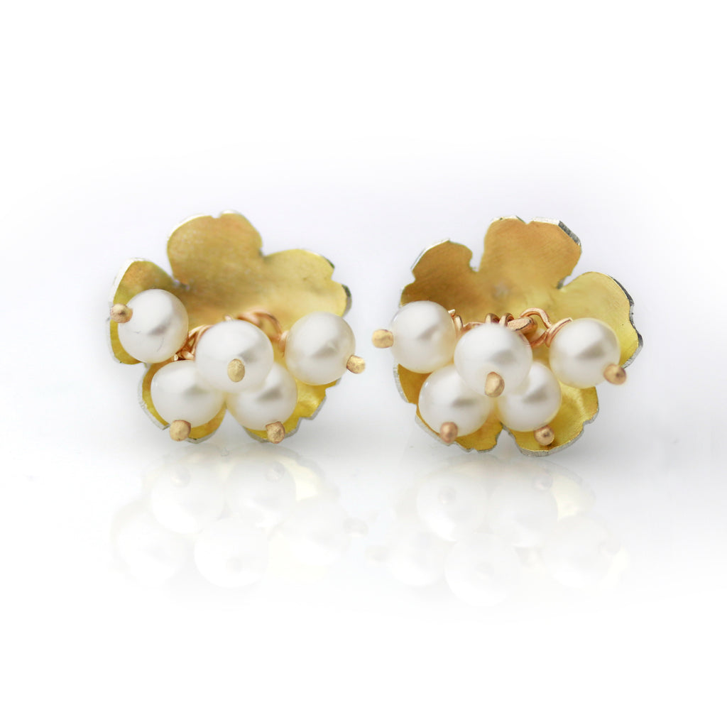 Sweet little daisies of 18k gold and silver bimetal* are sawn by hand, shaped and given a brushed finish. At the center is a cluster of freshwater pearls on 14k gold headpins. Post is 14k and secured with silicon earnuts for comfort and stability.