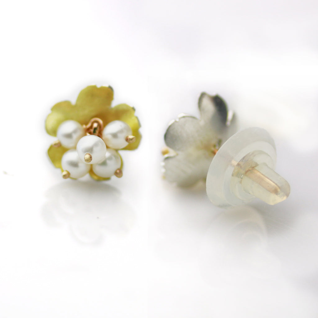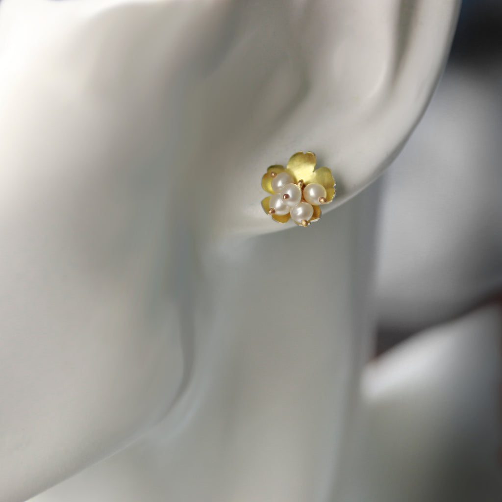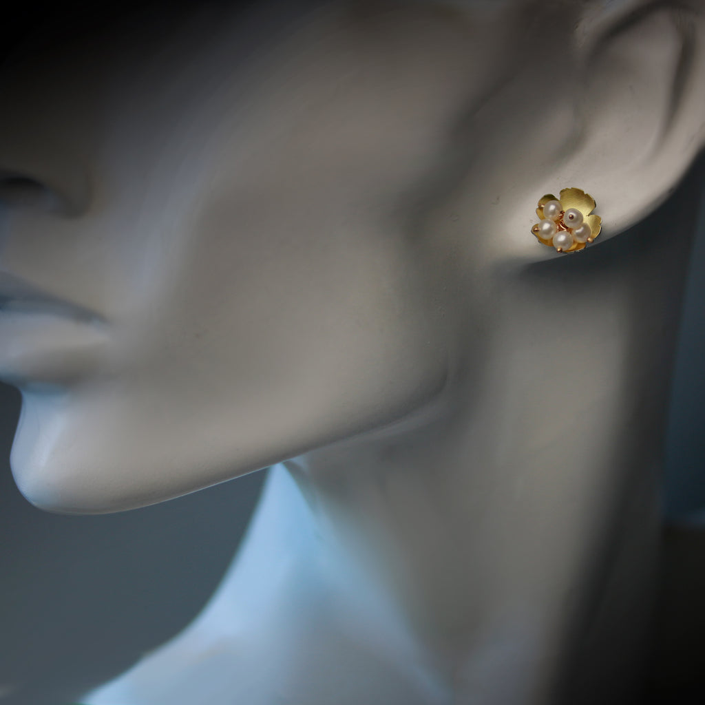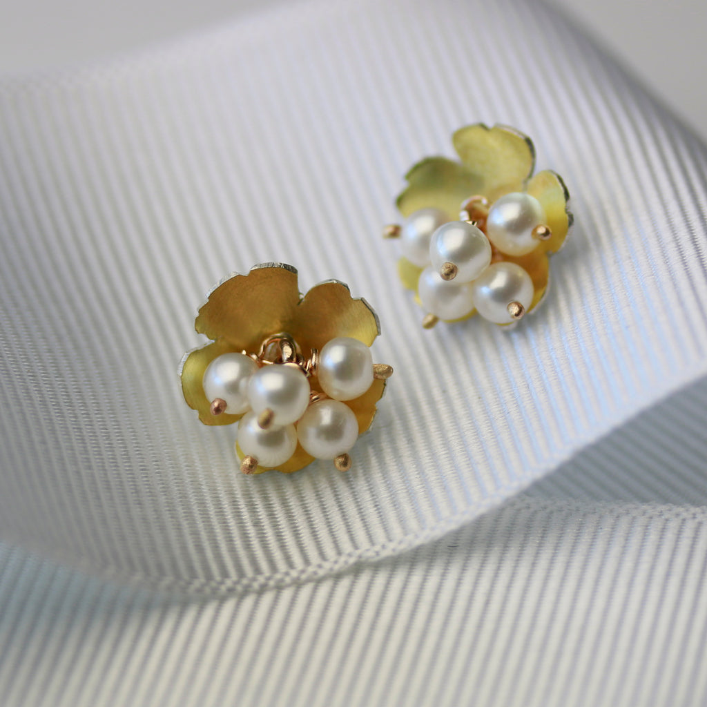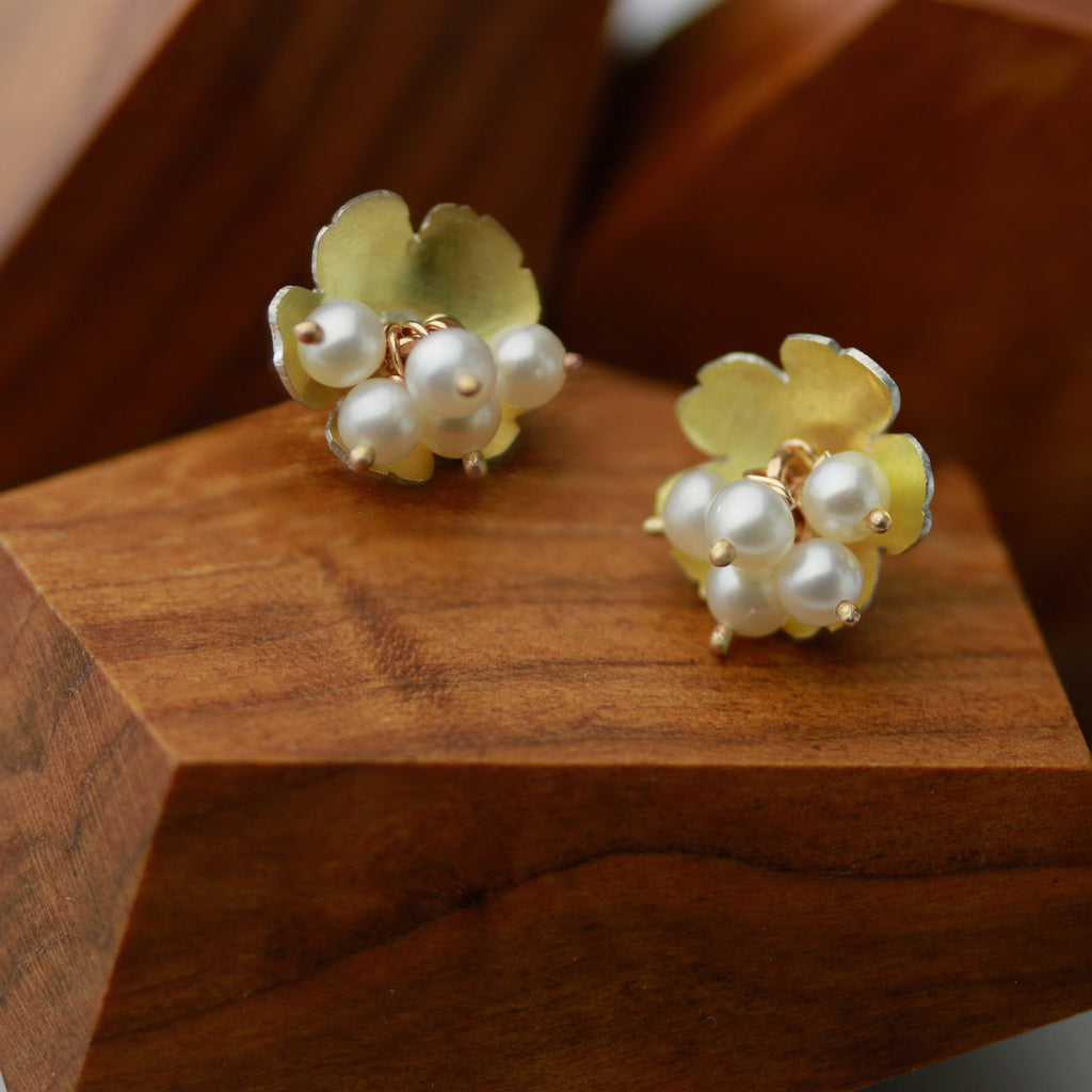 Sweet little daisies of 18k gold and silver bimetal* are sawn by hand, shaped and given a brushed finish. At the center is a cluster of freshwater pearls on 14k gold headpins. Post is 14k and secured with silicon earnuts for comfort and stability.