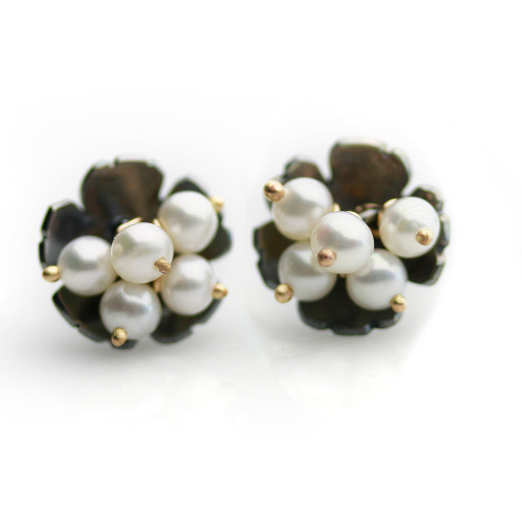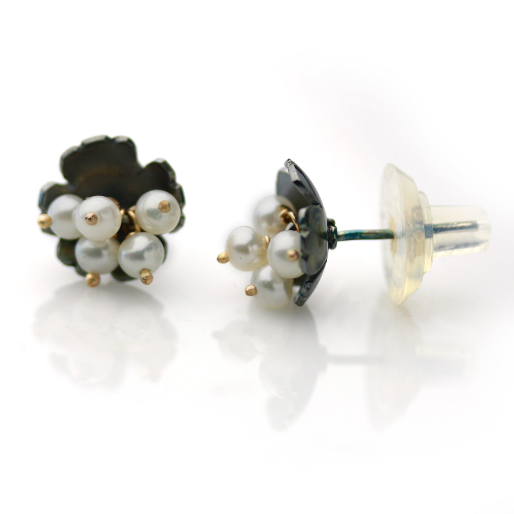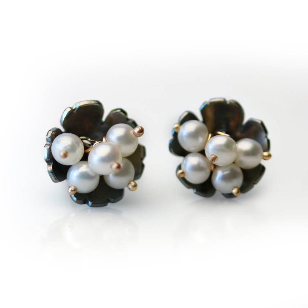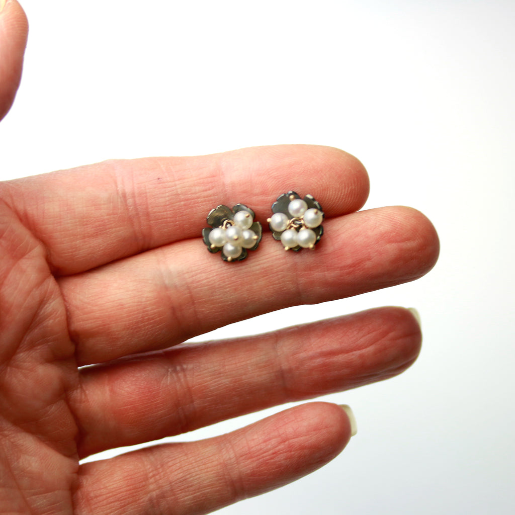 Sweet little daisies of silver are sawn by hand, shaped and oxidized. At the center is a cluster of freshwater pearls on 14k gold headpins. Post is silver and secured with silicon earnuts for comfort and stability.