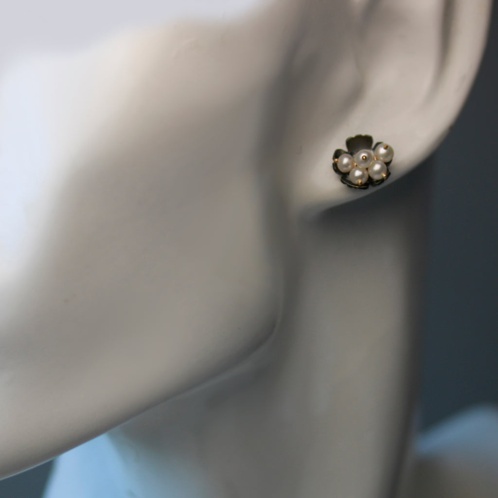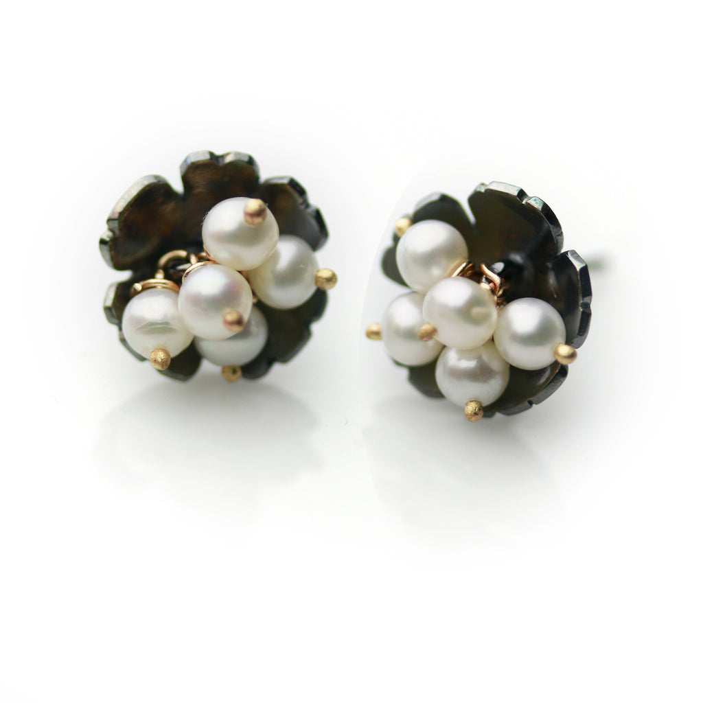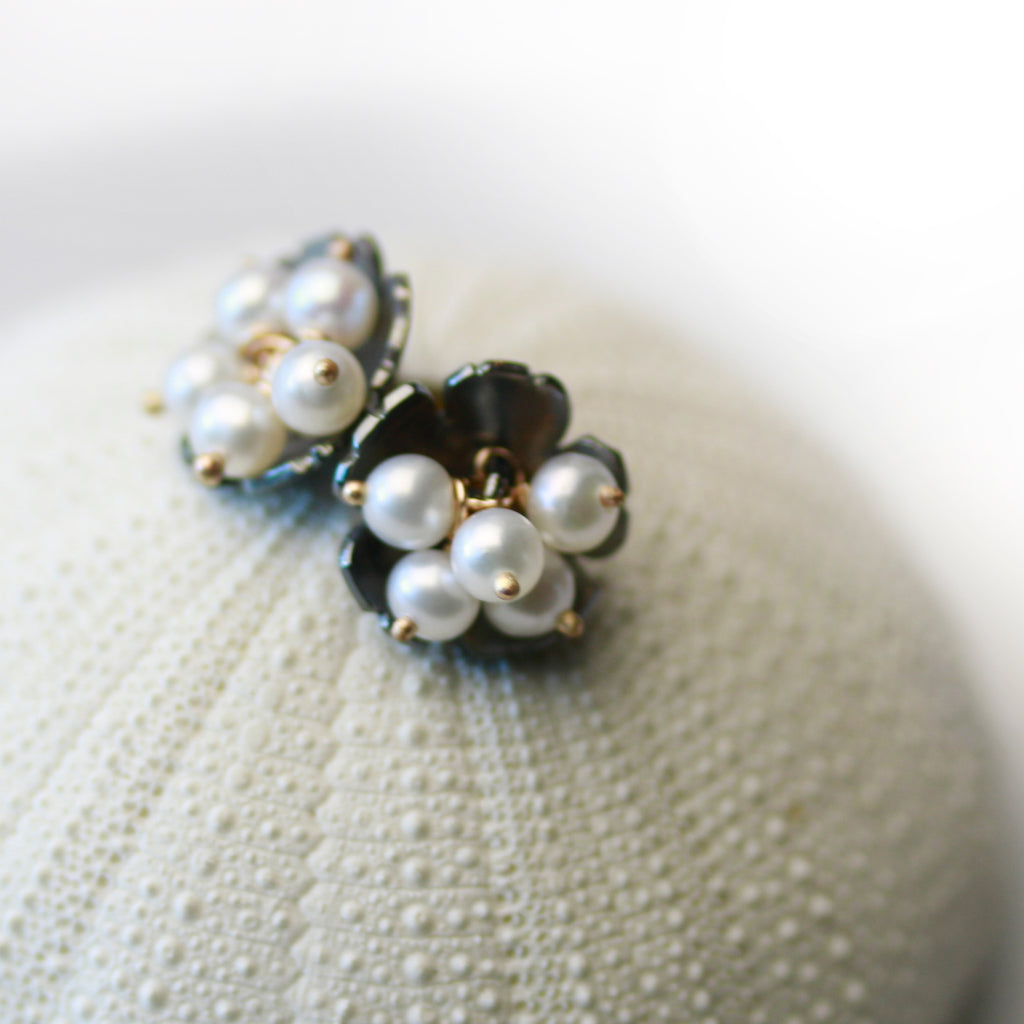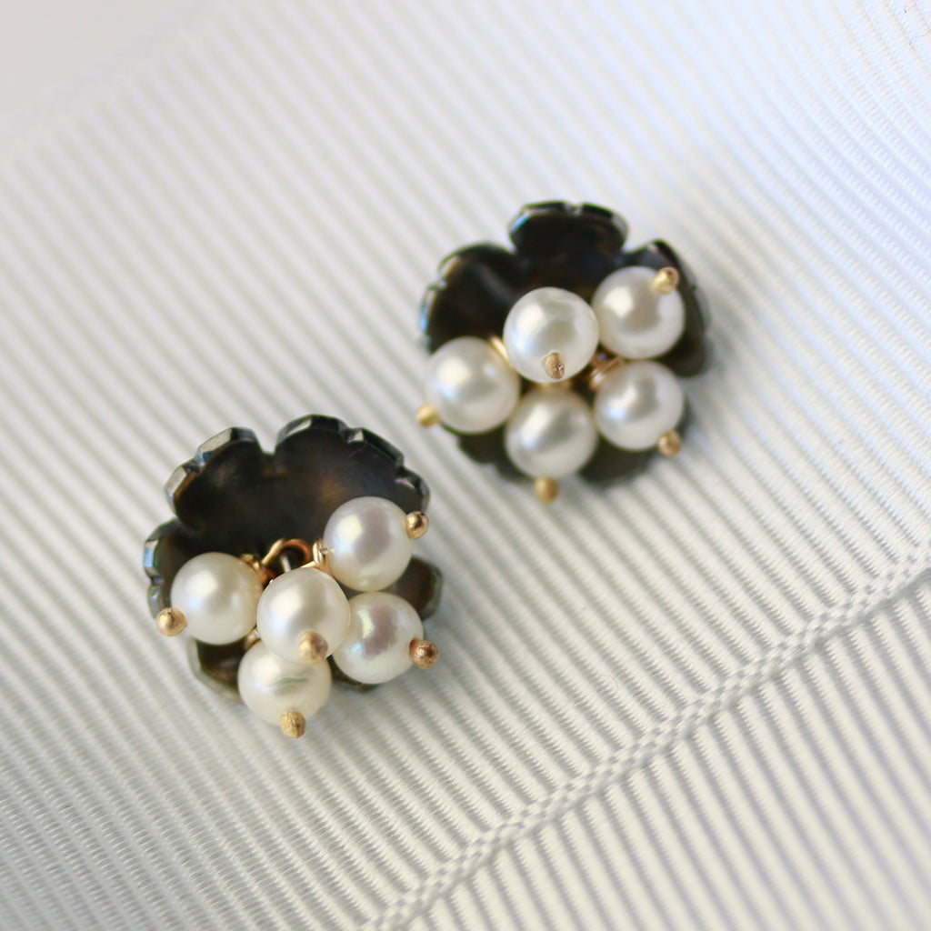 Sweet little daisies of silver are sawn by hand, shaped and oxidized. At the center is a cluster of freshwater pearls on 14k gold headpins. Post is silver and secured with silicon earnuts for comfort and stability.