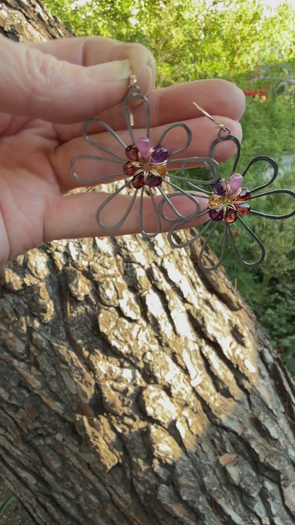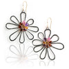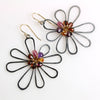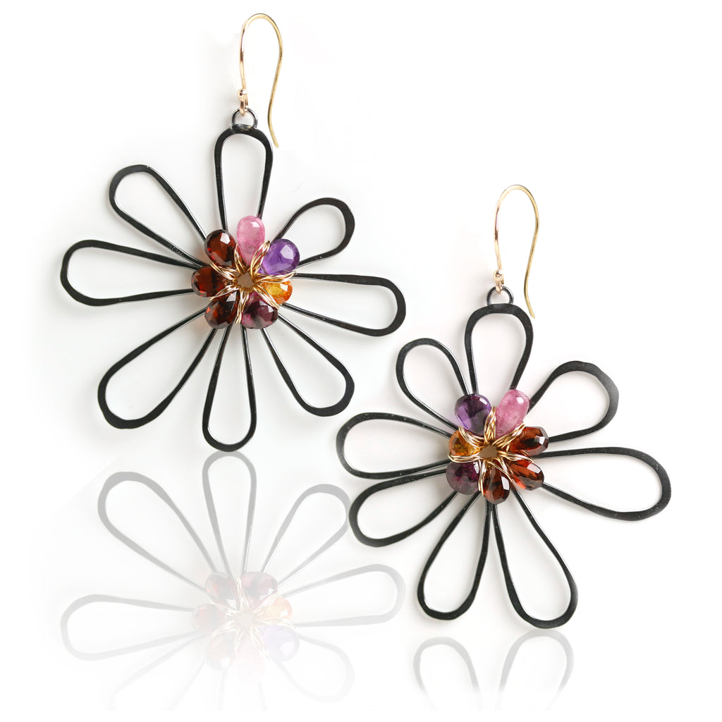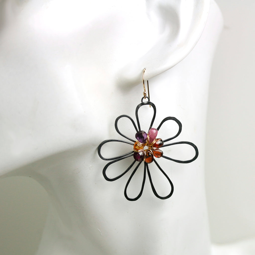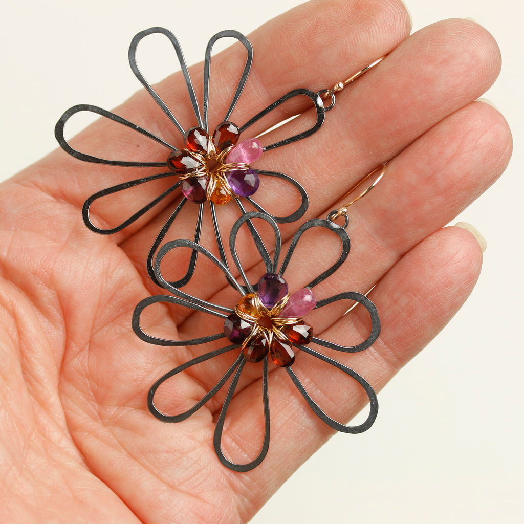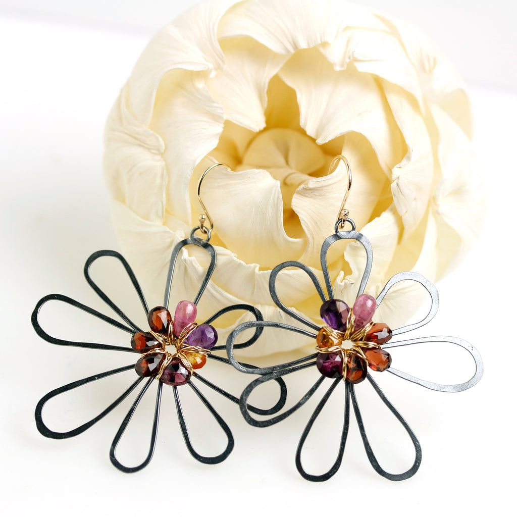 These are freeform, spirited and fun. I created a background flower of oxidized silver and weaved a gemstone briolette flower on top. The gemstones include rich red garnet, orange garnet, pink sapphire, amethyst and rhodolite garnet.