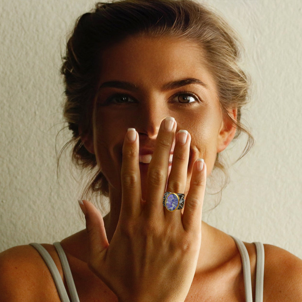 This semi-black opal from Lightning Ridge Australia measures 19.00mm x 13.48mm x 4.66mm and weighs 7.77ct. The gray potch material creates a fantastic cellular or webbed pattern with violet purple that flashes under light. I've wrapped it in 22k gold and set it on a wide band of oxidized silver with fused silver sprouts. The band is 5/8 of an inch at the front and tapers to 7/16 of an inch at the back. It fits like a size 9 - 9 1/4.