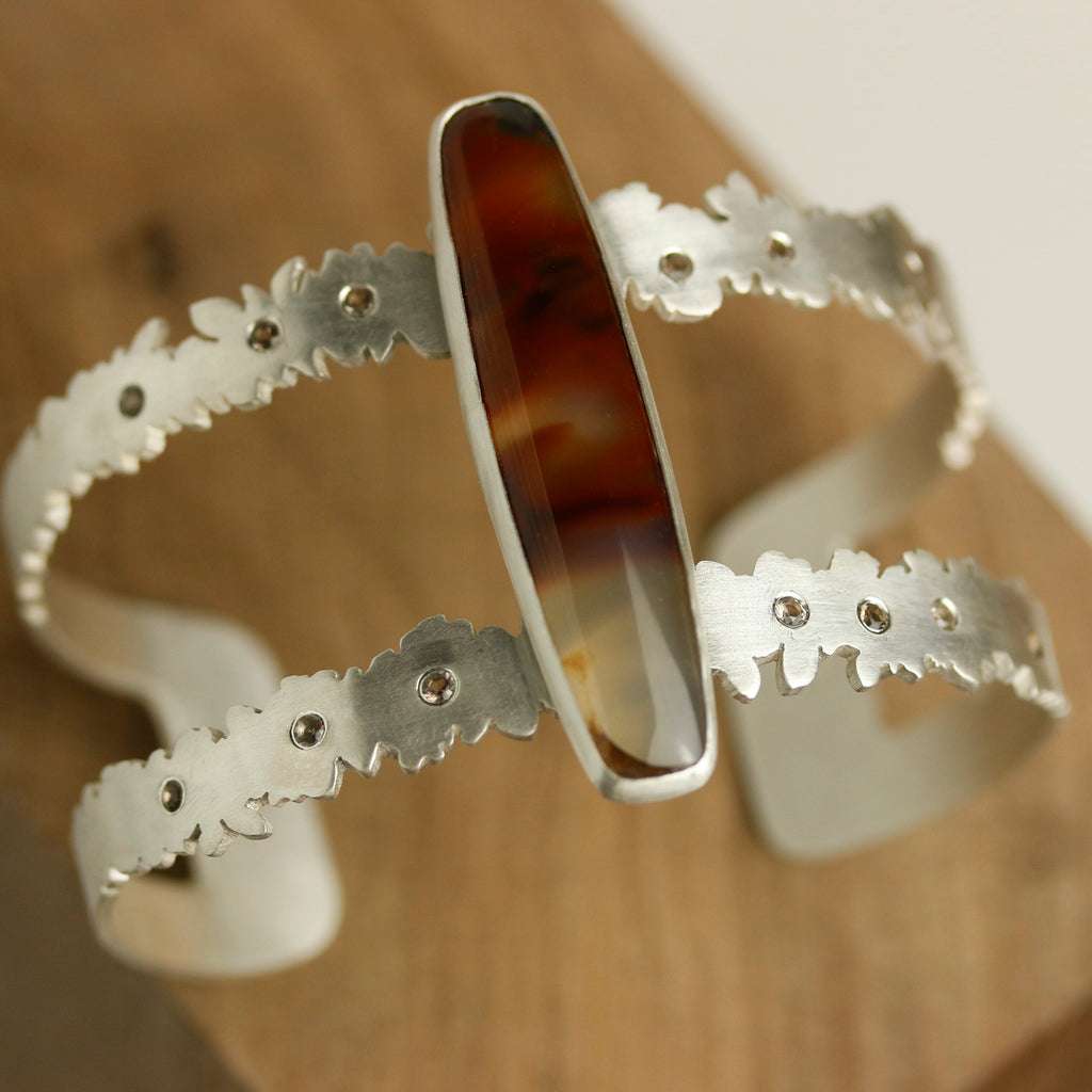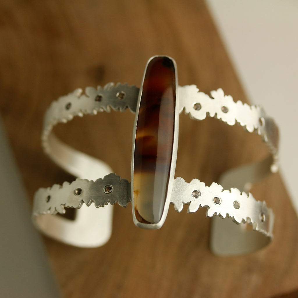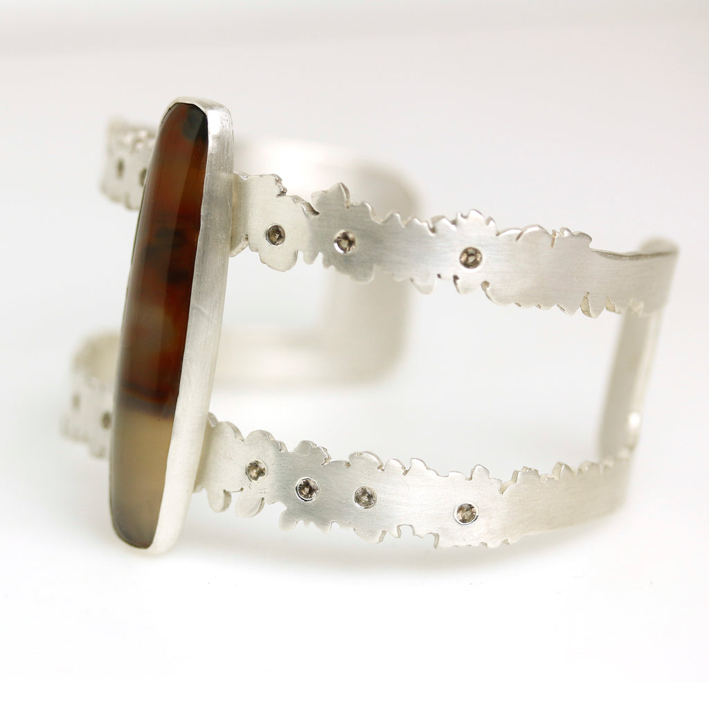 A long cut of brazilian agate sits atop a botanical cuff of argentium sterling silver. I sawed them leaf and flower-like outlines of a double strap cuff and scattered 13 smoky quartz like flower centers, along the cuff's length.