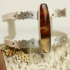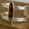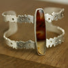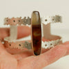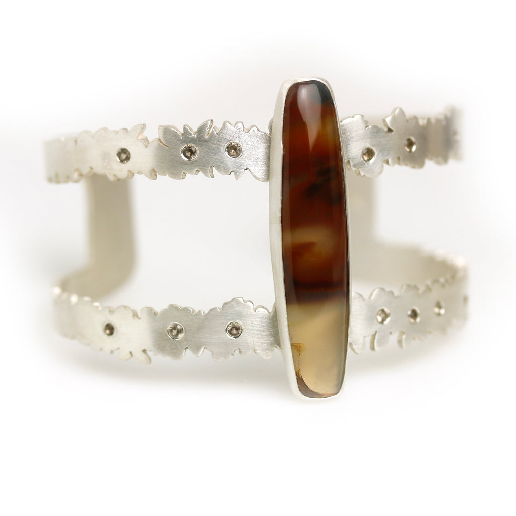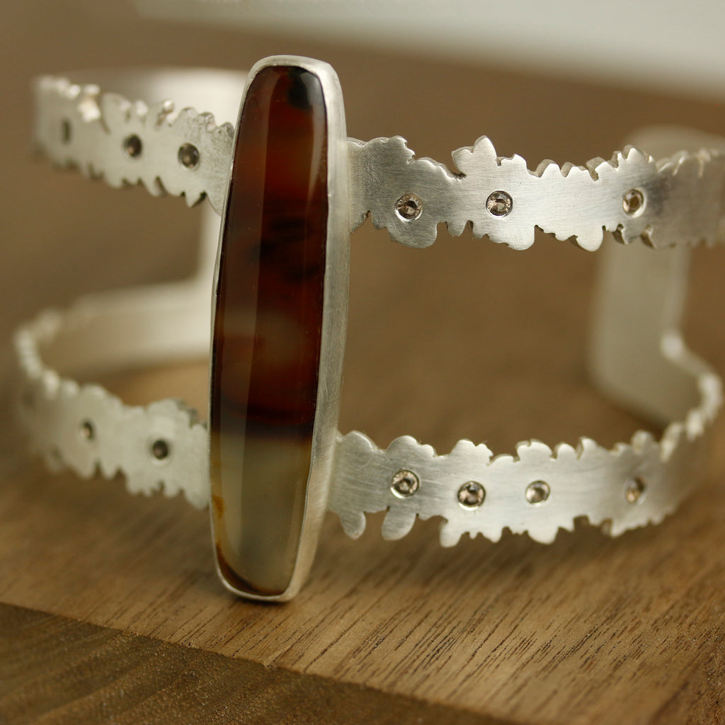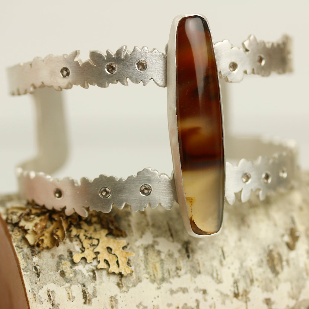 A long cut of brazilian agate sits atop a botanical cuff of argentium sterling silver. I sawed them leaf and flower-like outlines of a double strap cuff and scattered 13 smoky quartz like flower centers, along the cuff's length.