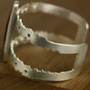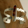 The agate measures 1 3/4 by 3/8 inches. The cuff's interior dimensions are 2 7/16 inches by 2 inches with a 1 1/8 inch opening to fit an average wrist.