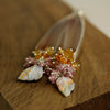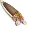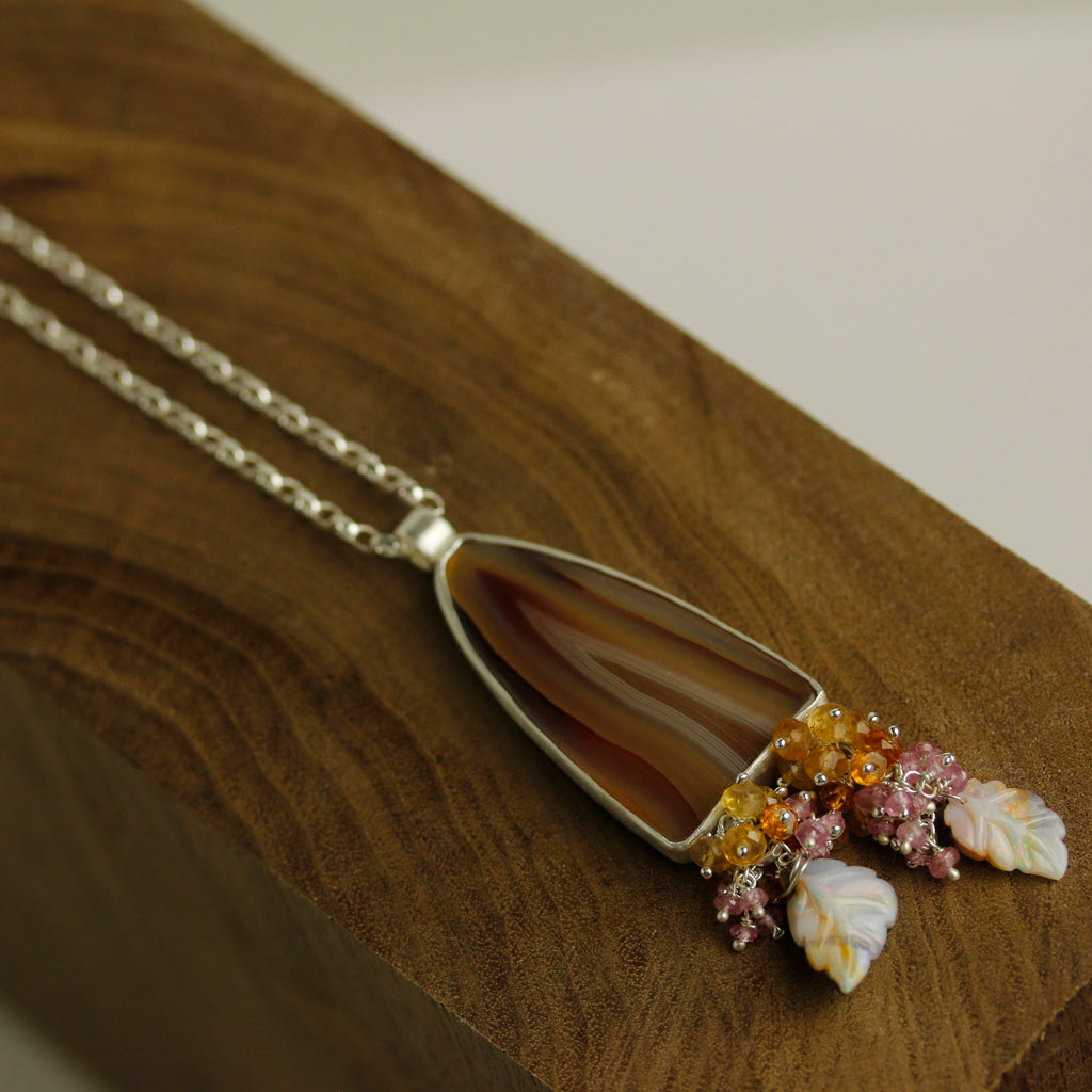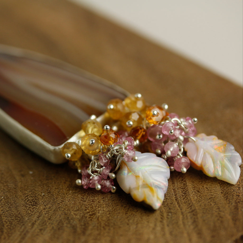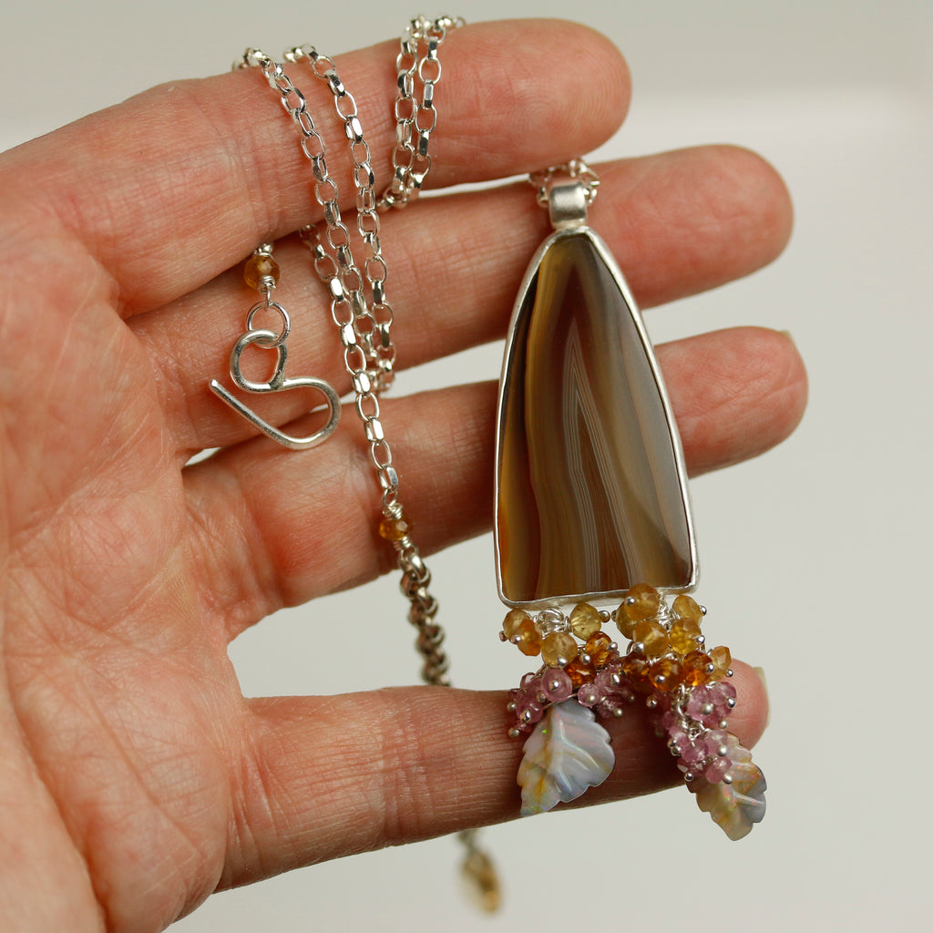 This gorgeous brazilian agate has delicate fawn brown striations reminiscent of wood grain. It is secured in fine and argentium silver. Below the agate are two descending columns of clustered gemstones that terminate in two carved feathers of australian boulder opal. The clustered stones include pink sapphire, mandarin garnet and hessonite garnet.