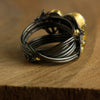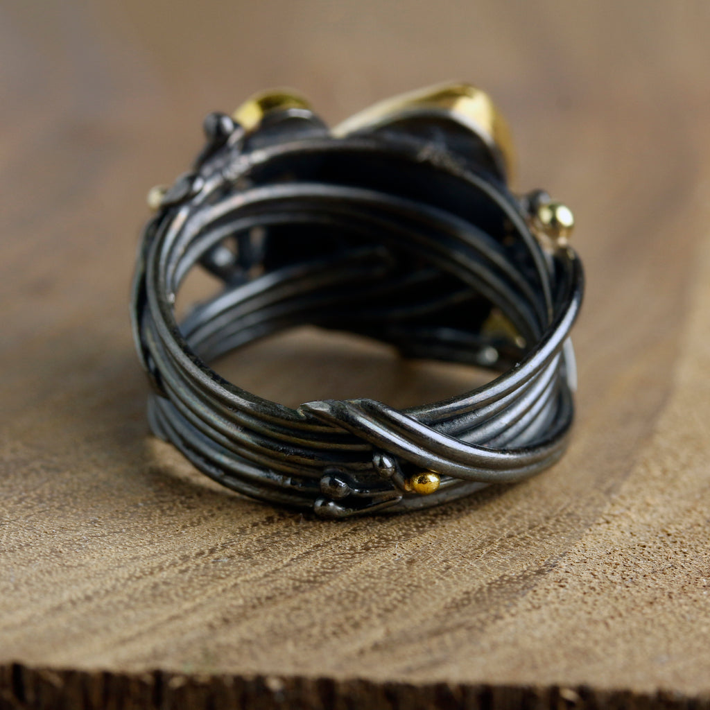 Swirls of oxidized silver wire, sprouts and gold dots wrap around your finger. I've included shots of this ring band at several angles to reveal the details.