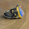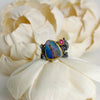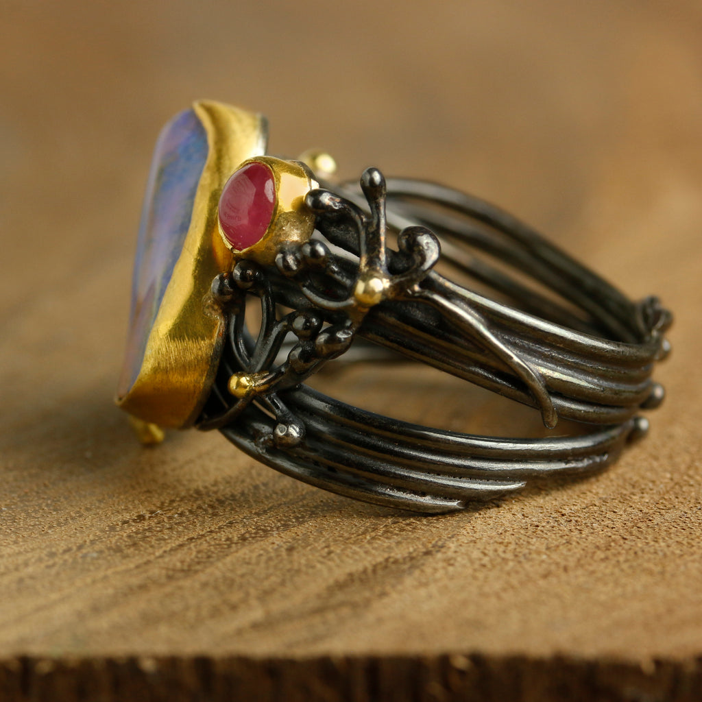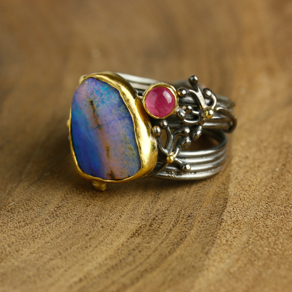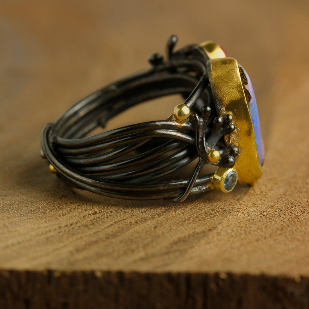 Look at this boulder opal!!! Cobalt blue, to violet, to soft rose and the delightful texture of the host rock showing through from the bottom. I've wrapped it in 22k gold and set it on one of my tangled vine rings.