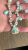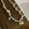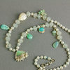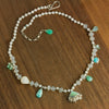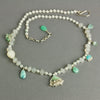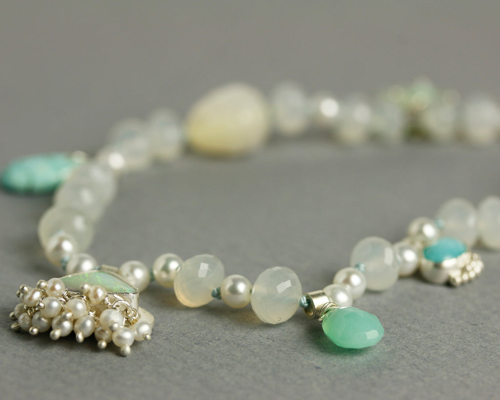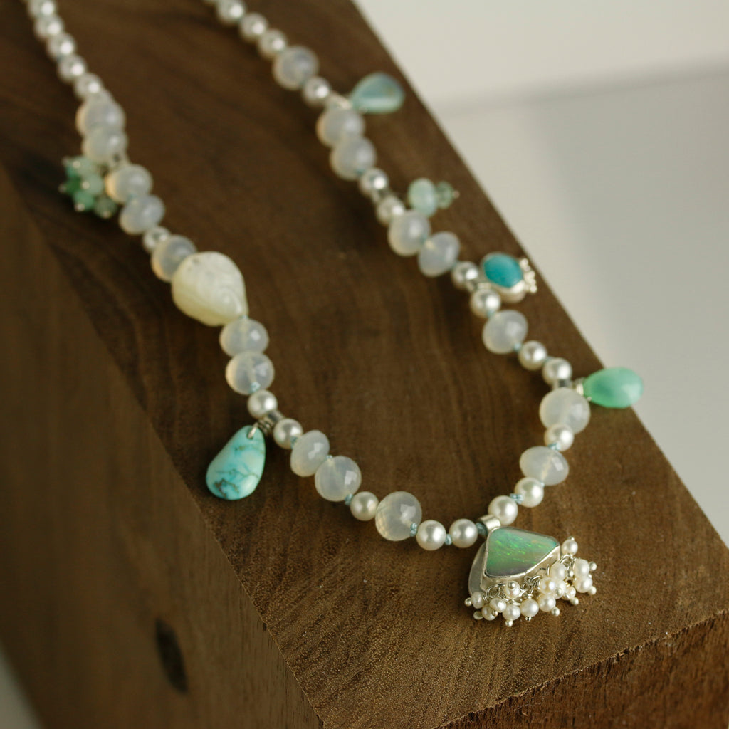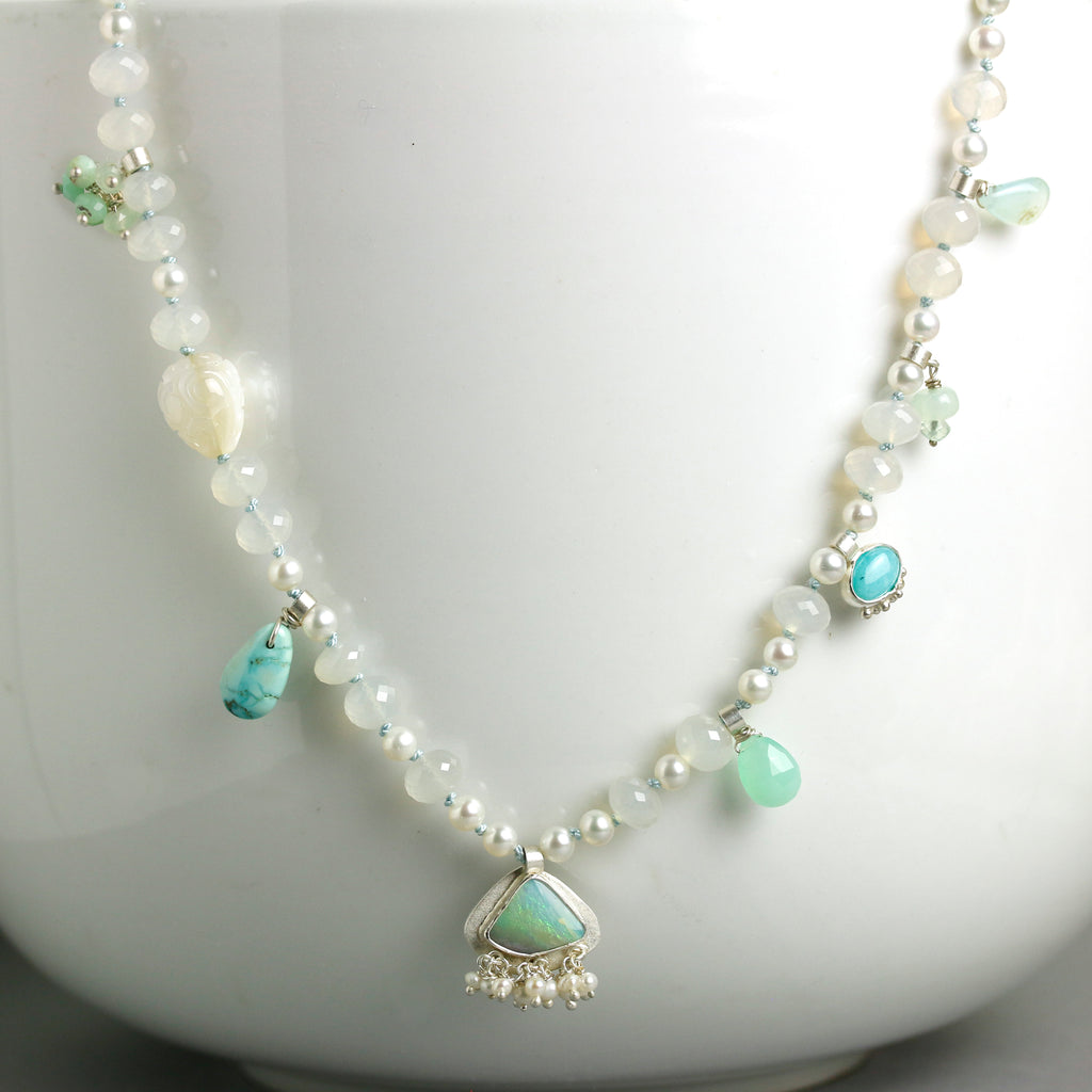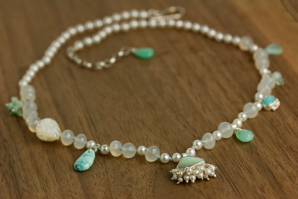 In addition, amazonite, chrysoprase, and blue peruvian opal charms, as well as a carved mother of pearl bead are spaced along the length of the necklace.