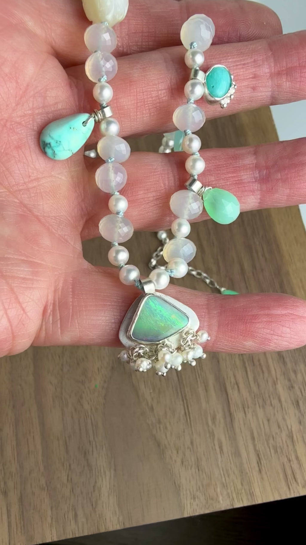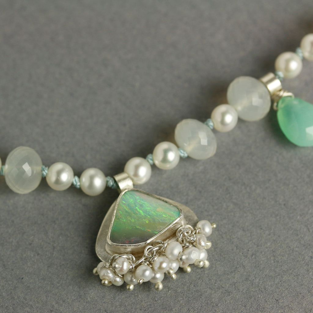 The boulder opal with pretty green details forms the focal with a lush fringe of freshwater pearls below. Zoom in on that opal and see how gorgeous it is.