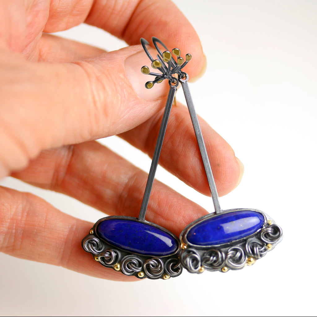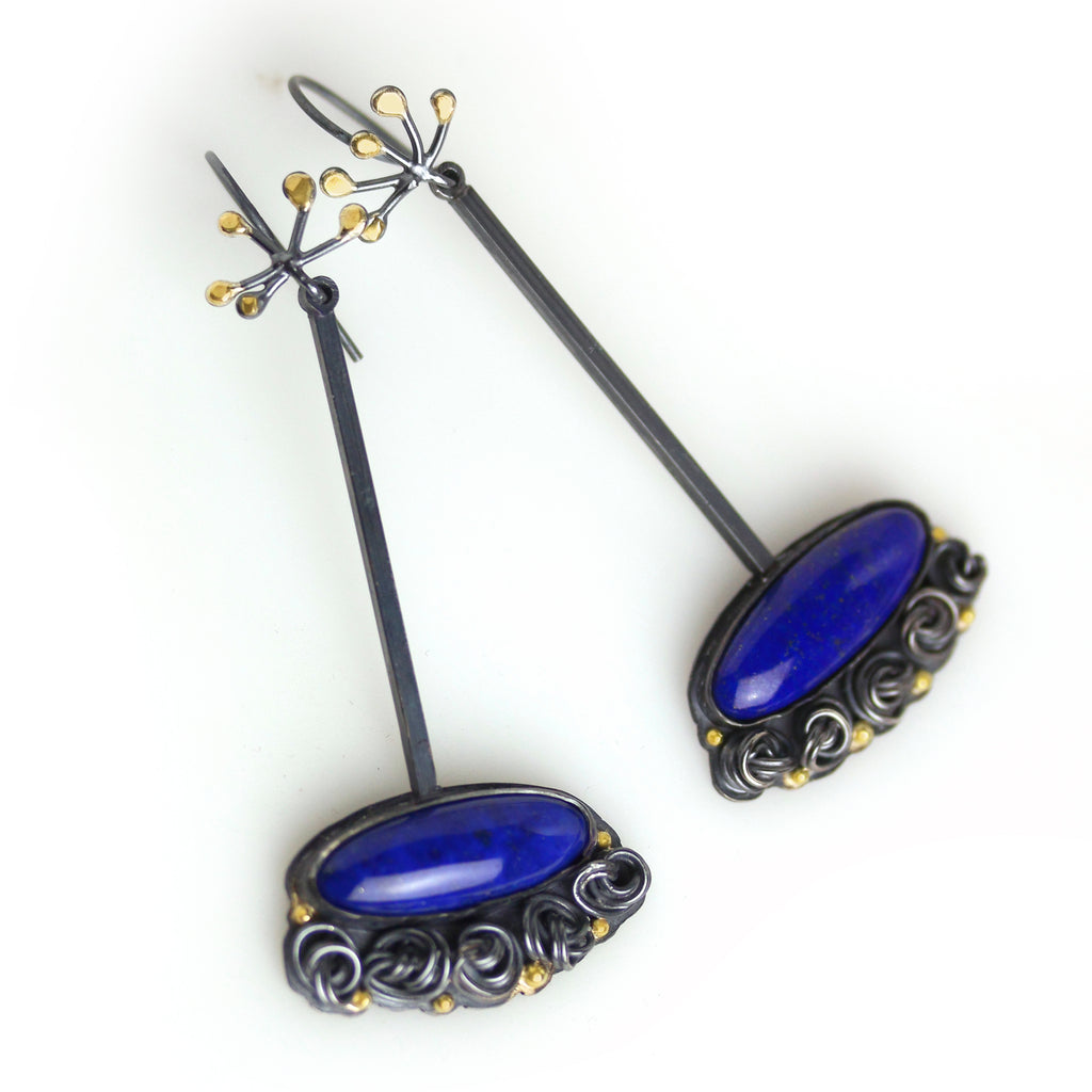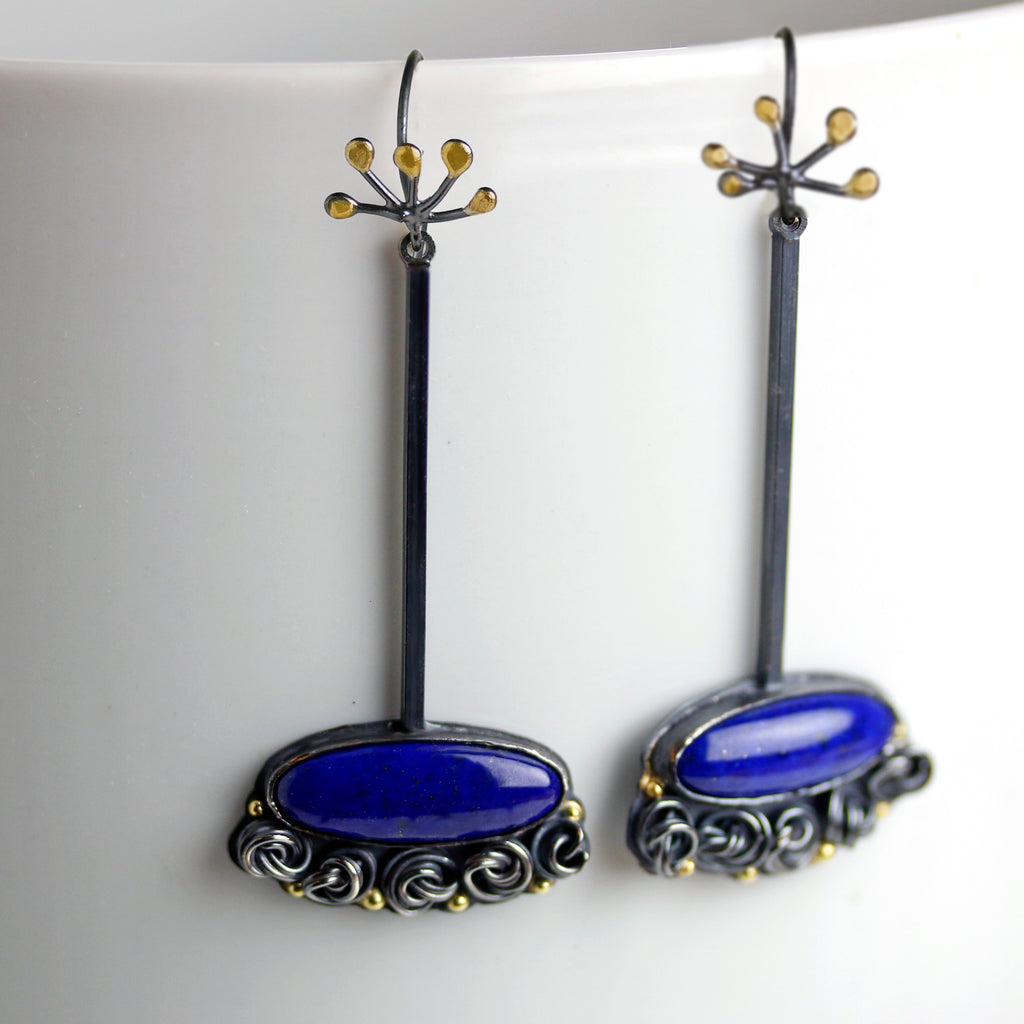 Lapis ovals are outlined in oxidized silver with an embellished lower edge of my french knots and gold dots embroidery motif--crafted in silver and 18k gold. The lapis swings on an elongated square wire from my sprout earwires with 18k accents. These earrings measure 1 1/8 inches wide and 2 1/2 inches long.