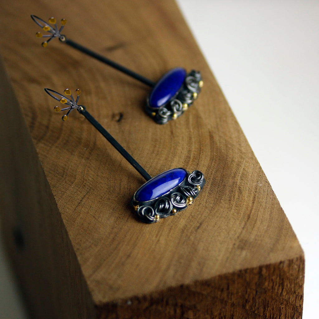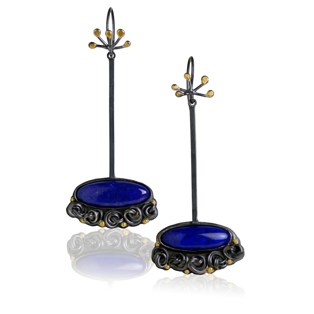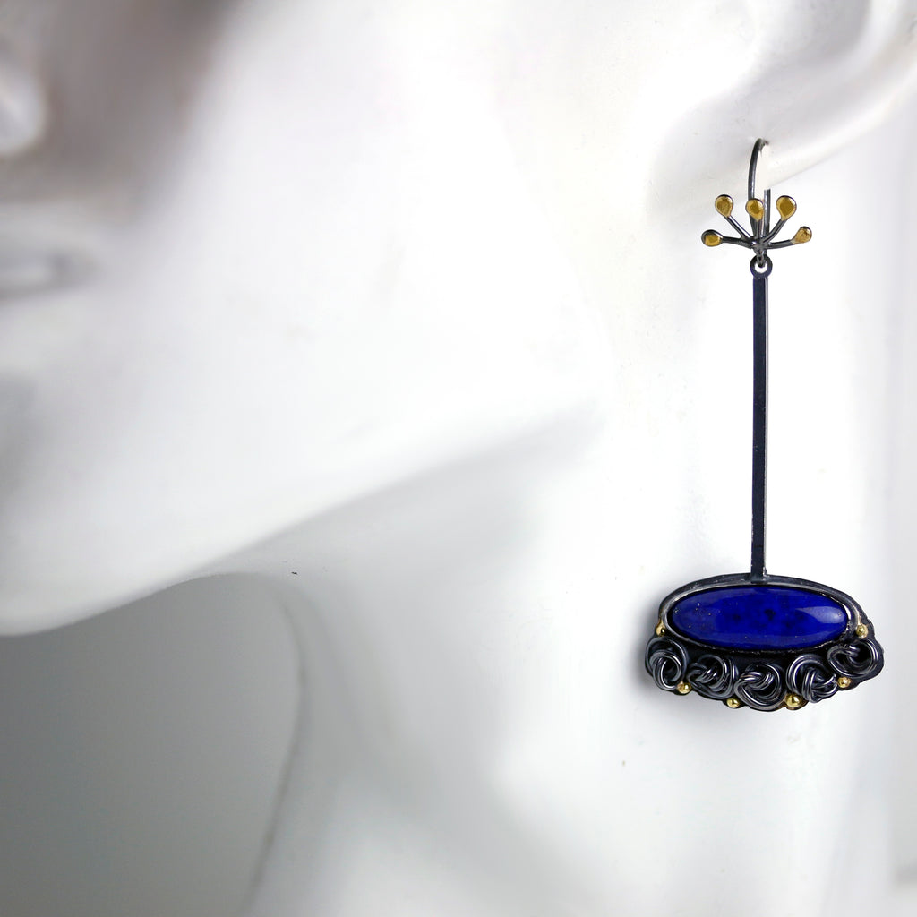 Lapis ovals are outlined in oxidized silver with an embellished lower edge of my french knots and gold dots embroidery motif--crafted in silver and 18k gold. The lapis swings on an elongated square wire from my sprout earwires with 18k accents. These earrings measure 1 1/8 inches wide and 2 1/2 inches long.