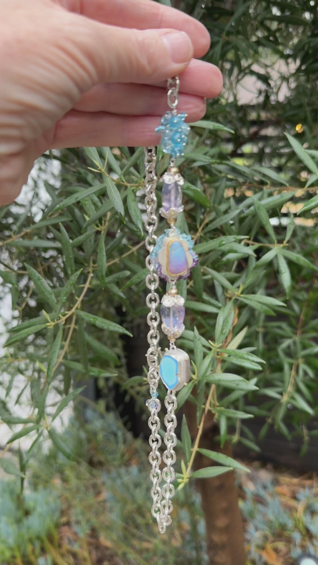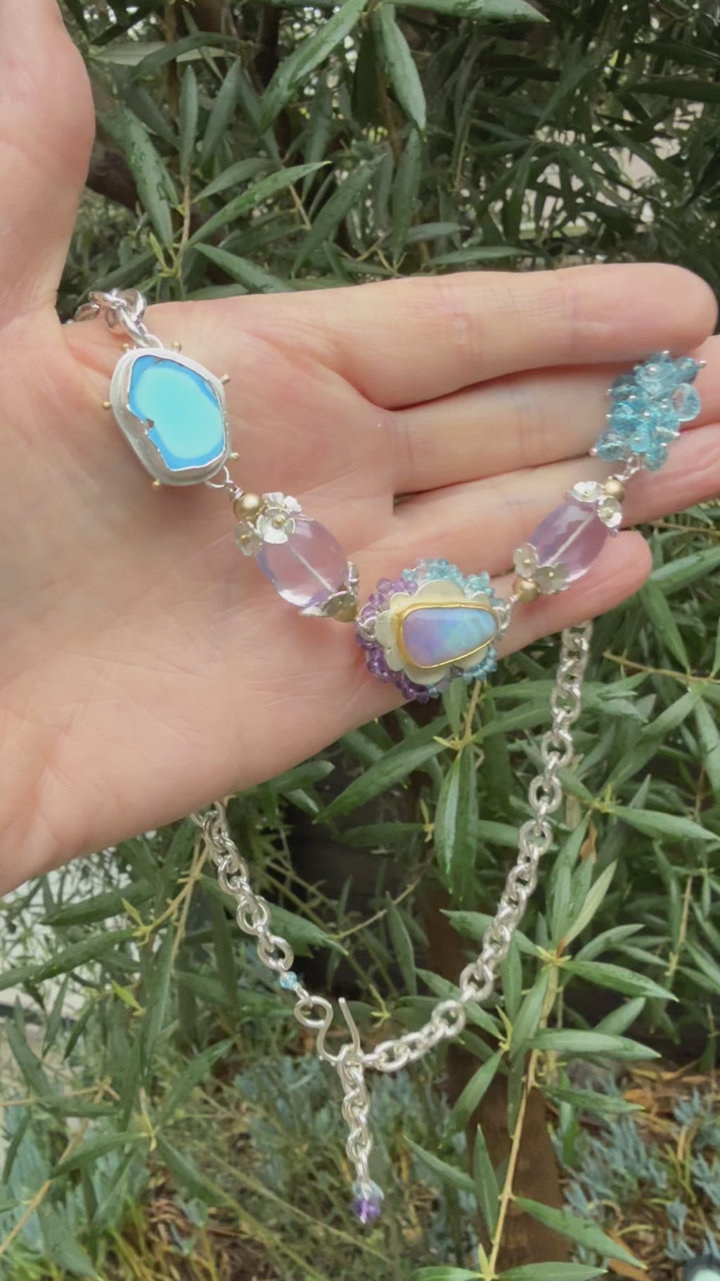 Boulder opal wrapped in a 22k gold bezel on a scalloped silver frame with wired rondelles of swiss blue topaz and amethyst
