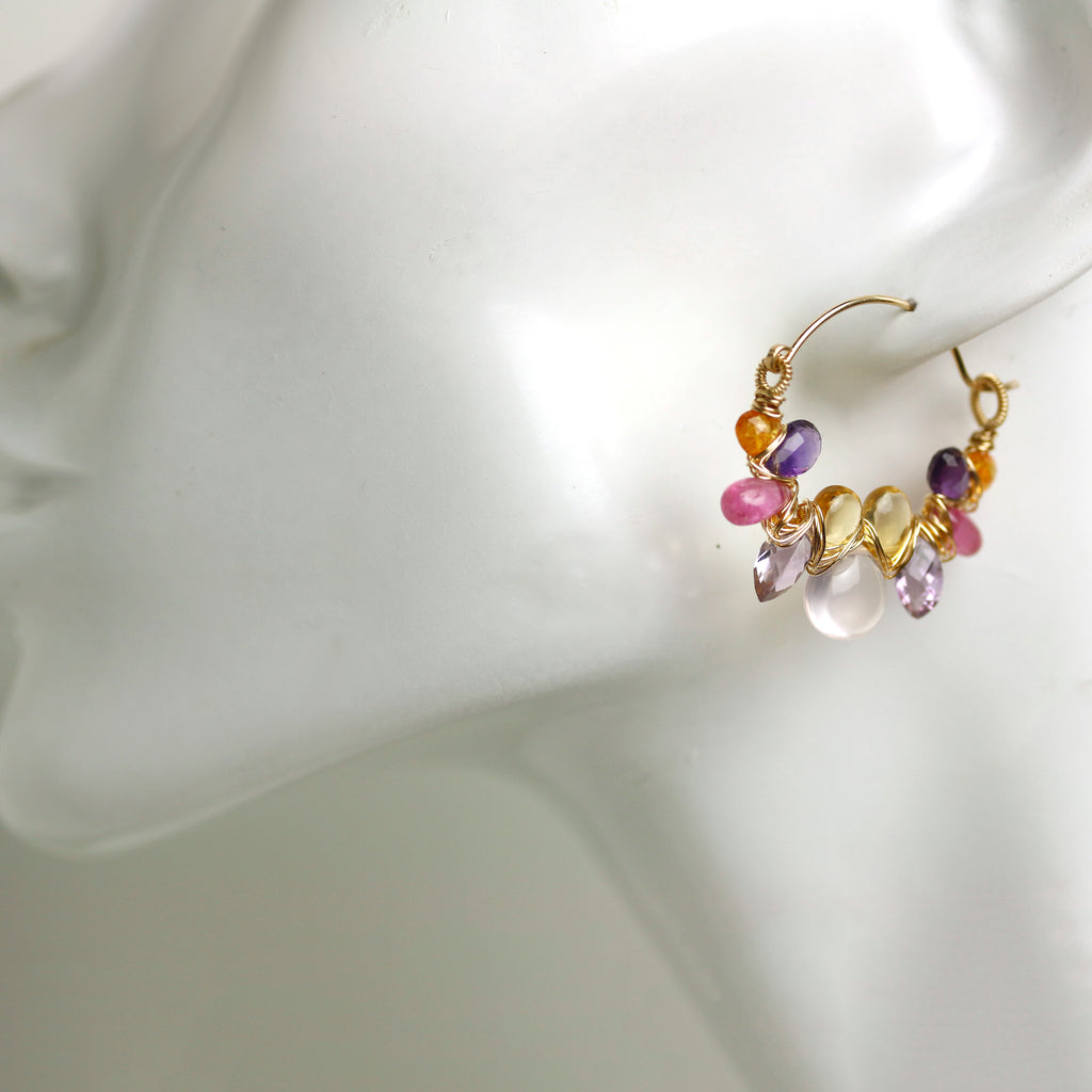 Fine gauge gold fill wire weaves together an arc of gemstone briolettes to form the lower edge of these hoops.