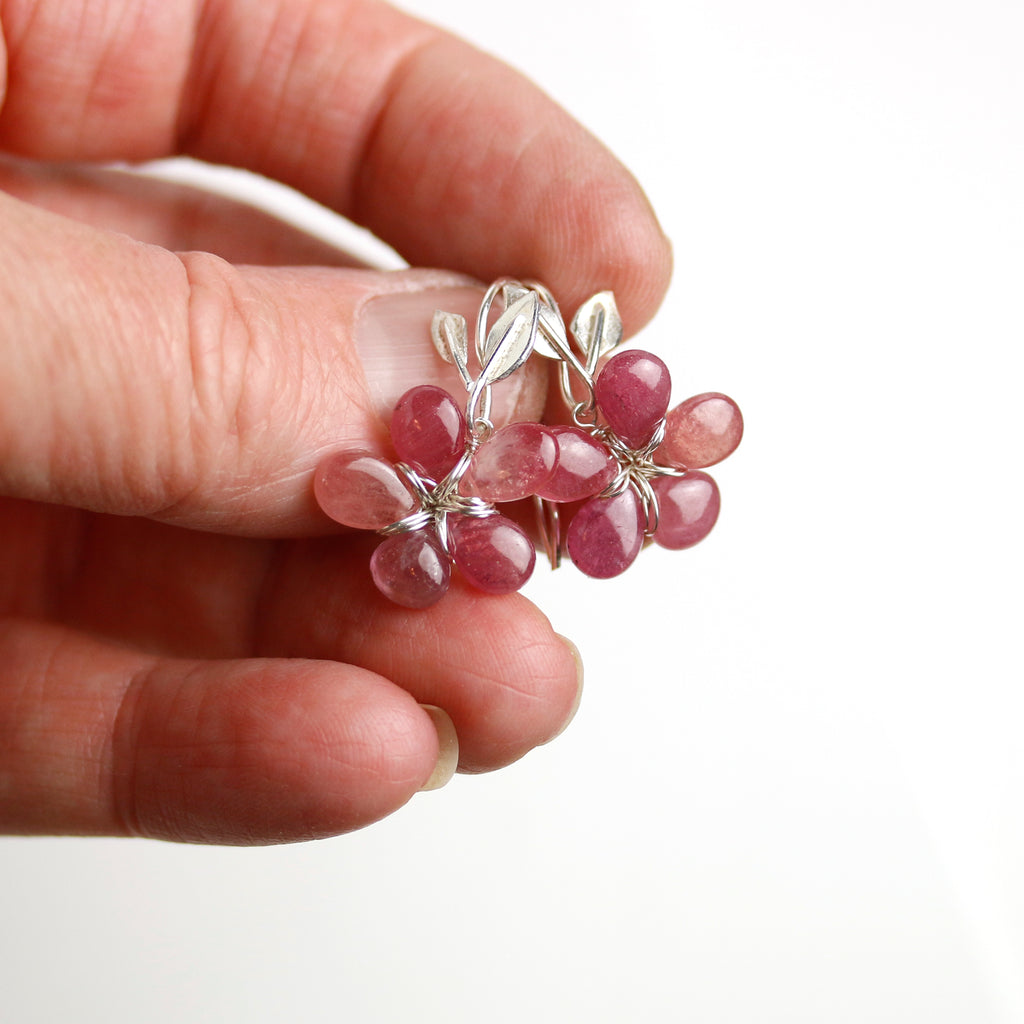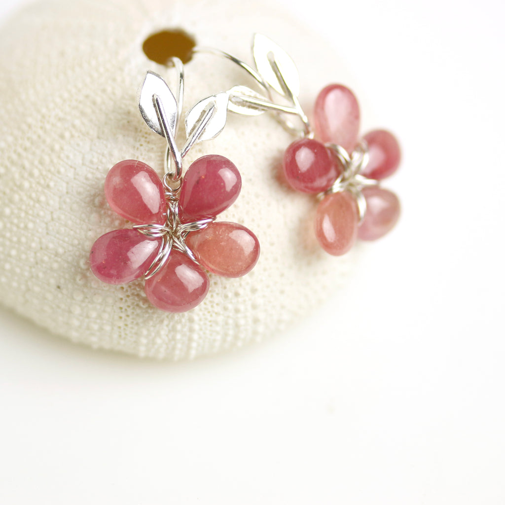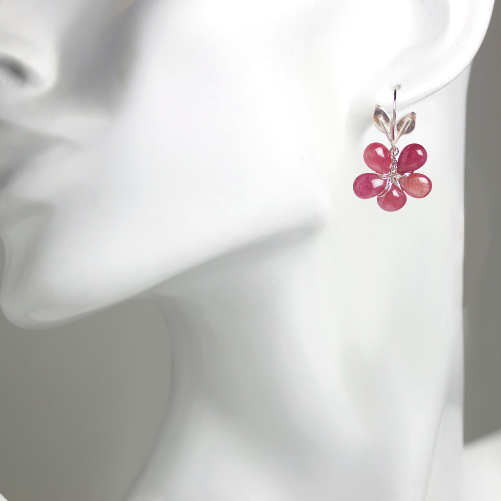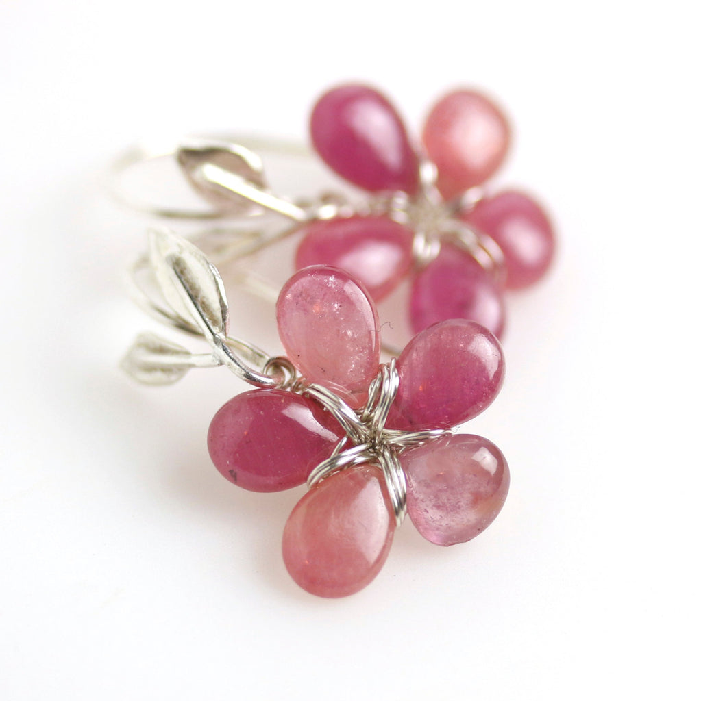 Rosy pink sapphire petals are woven with tarnish-resistant argentium sterling silver wire to form sweet flowers. They dangle from silver stem and leaf earwires.