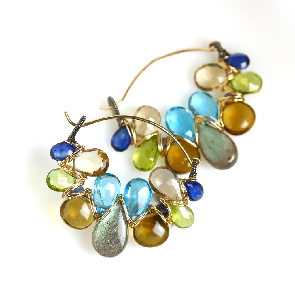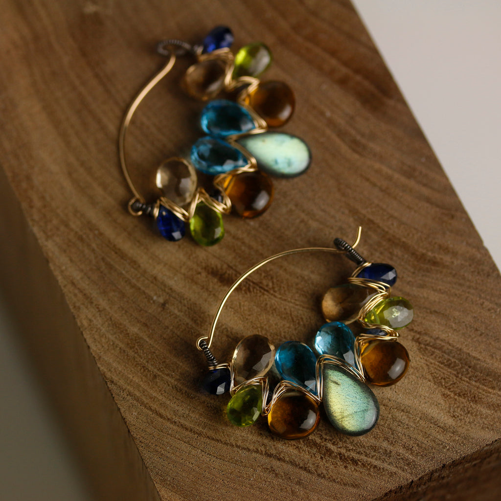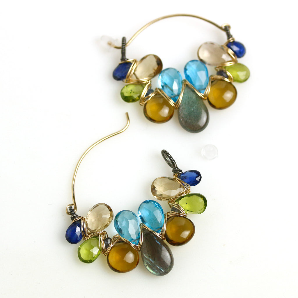 I've woven kyanite, champagne citrine, peridot, cognac quartz, swiss blue topaz and labradorite with gold fill and oxidized silver fine gauge wire in my signature gem-weave pattern to form a gem laden semi circle. A simple earwire of gold fill wire secures them to your ear. A small earring stopper is included for added security.