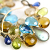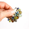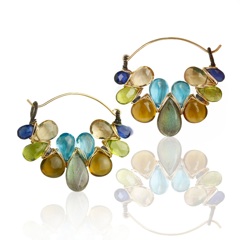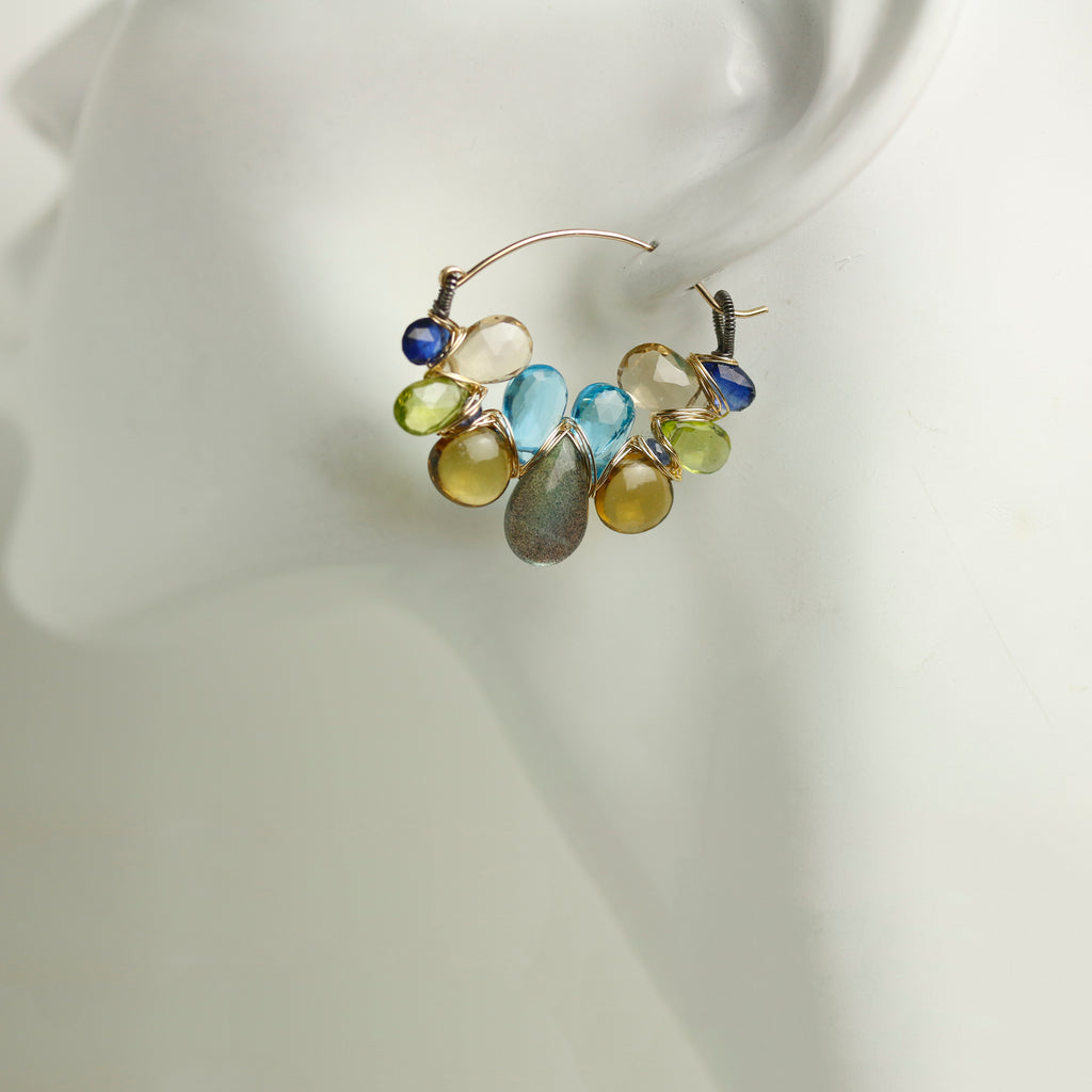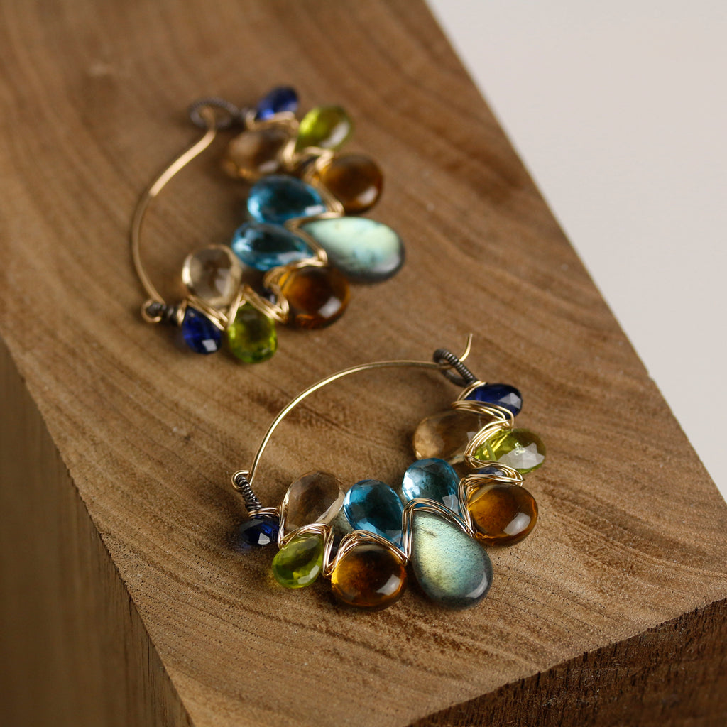 I've woven kyanite, champagne citrine, peridot, cognac quartz, swiss blue topaz and labradorite with gold fill and oxidized silver fine gauge wire in my signature gem-weave pattern to form a gem laden semi circle. A simple earwire of gold fill wire secures them to your ear. A small earring stopper is included for added security.