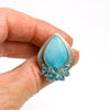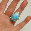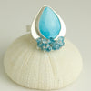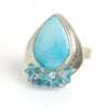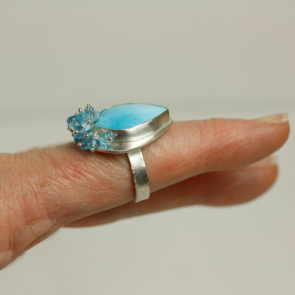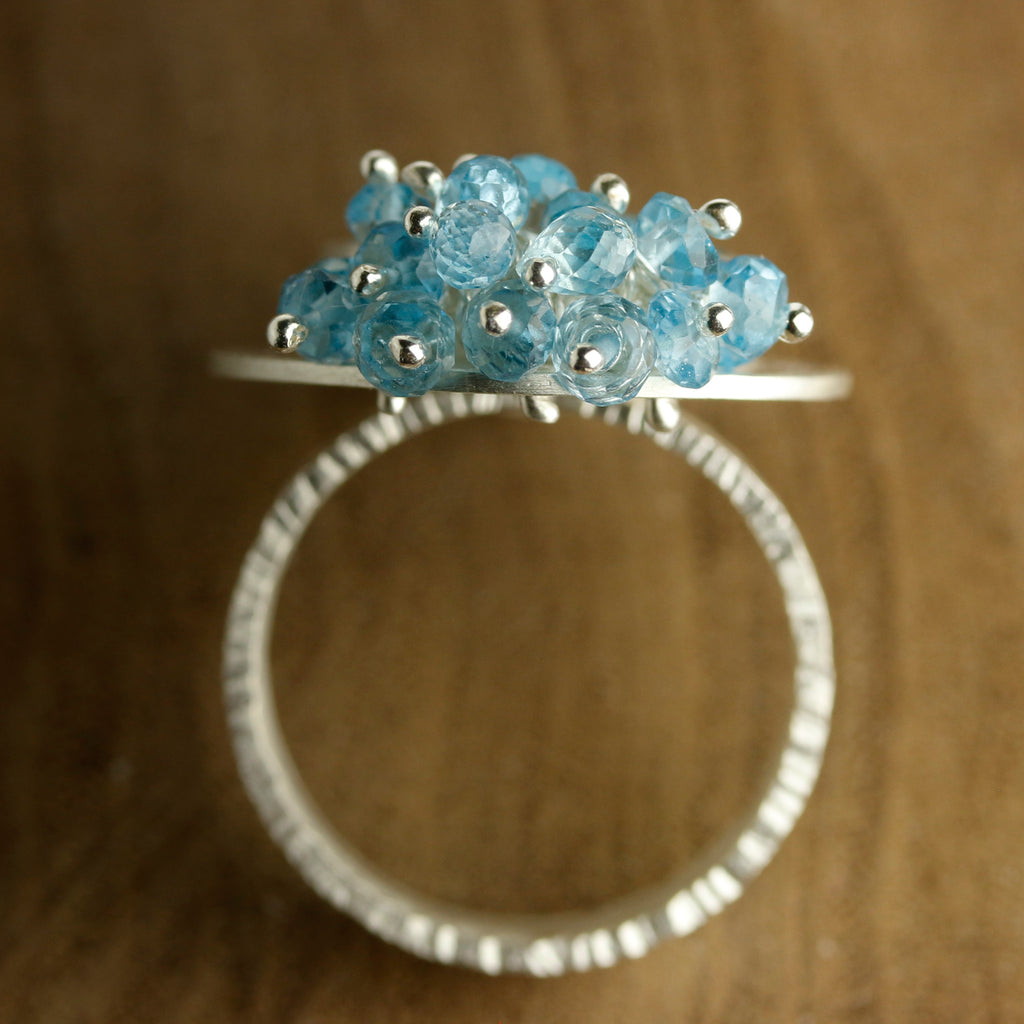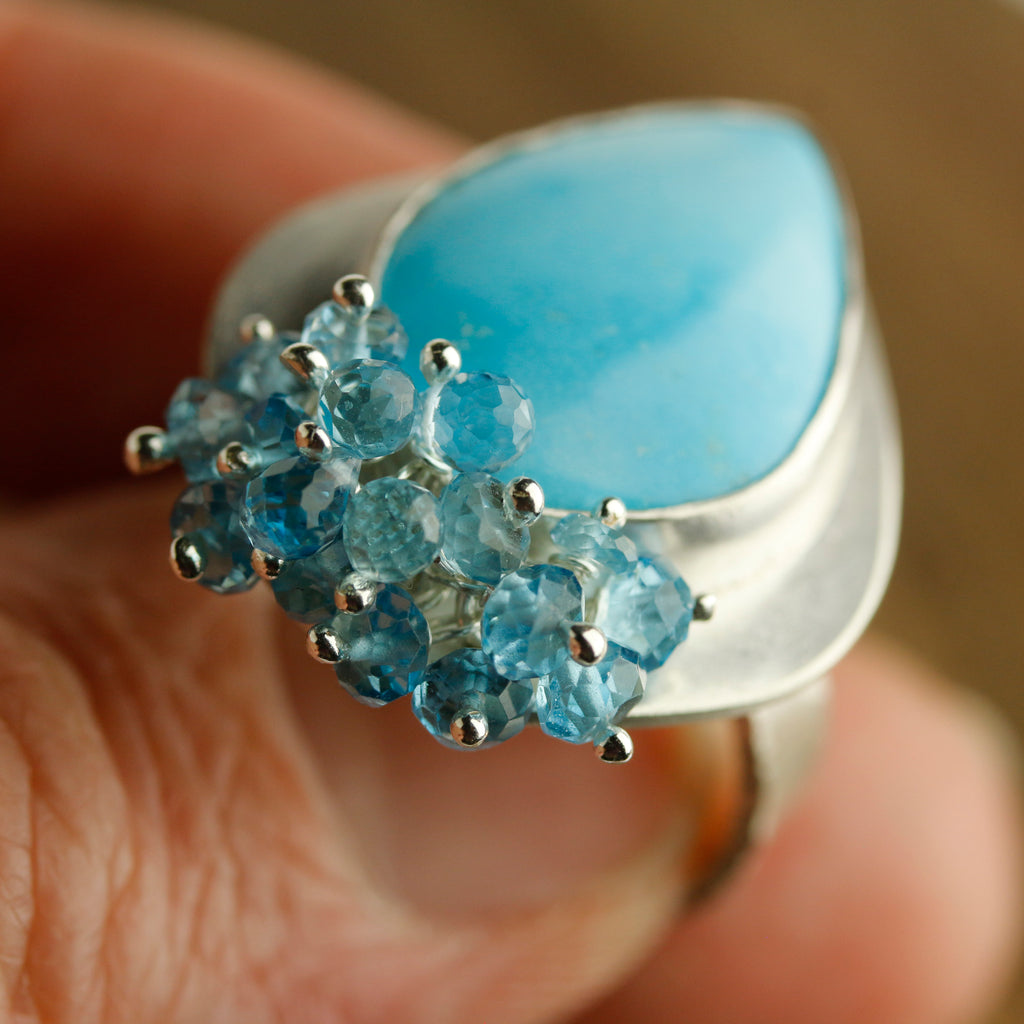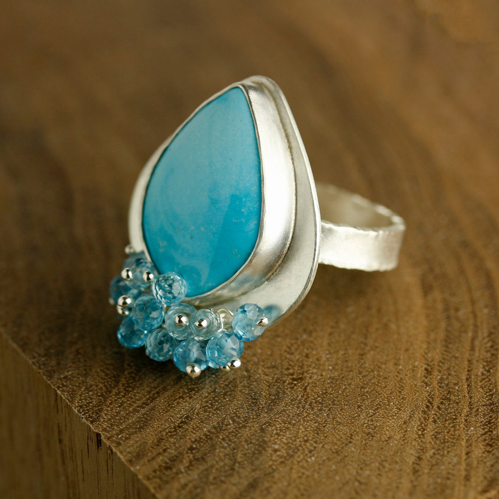 I've wrapped it in fine silver and placed it on a bed and ring band of argentium (tarnish-resistant) silver. A lush cluster of swiss blue topaz faceted beads on silver pins sits at the base.