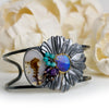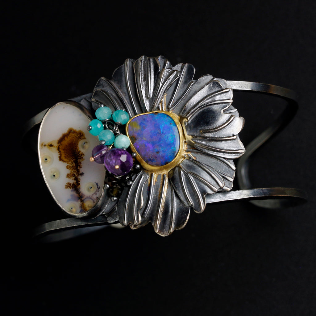 A boulder opal wrapped in 22k gold forms the flower's center a displays rich violets, browns and blues. Sculptural petals of oxidized silver frame the opal, opposite which sits a dendritic opal with chocolate brown, bubbling inclusions.